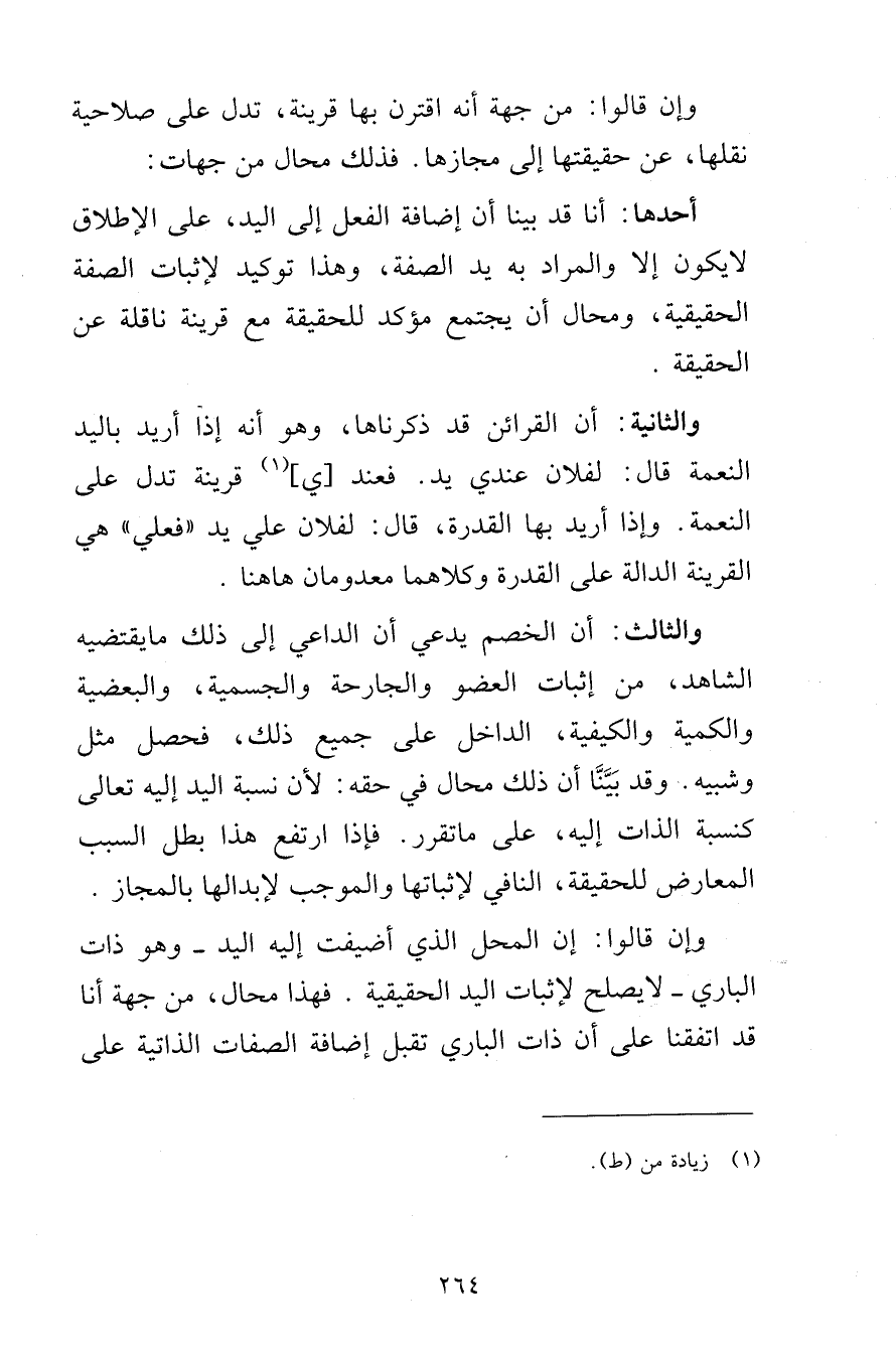 والثالث: أن الخصم يدعي أن الداعي إلى ذلك ما يقتضيه الشاهد، من إثبات العضو والجارحة والجسمية، والبعضية والكمية والكيفية، الداخل على جميع ذلك، فحصل مثل وشبيه. وقد بَيَّنَّا أن ذلك محال في حقه: لأن نسبة اليد إليه تعالى كنسبة الذات إليه، على ما تقرر. فإذا ارتفع هذا بطل السبب المعارض للحقيقة، النافي لإثباتها والموجب لإبدالها بالمجاز. وإن قالوا: إن المحل الذي أضيفت إليه اليد -وهو ذات الباري- لا يصلح لإثبات اليد الحقيقية. فهذا محال، من جهة أنا قد اتفقنا على أن ذات الباري تقبل إضافة الصفات الذاتية على