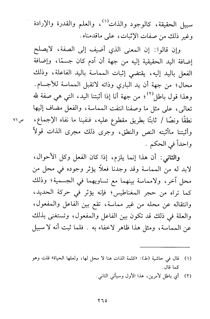 وإن قالوا: إن المعنى الذي أضيف إلى الصفة، لا يصلح إضافة اليد الحقيقية إليه من جهة أن آدم كان جسمًا، وإضافة الفعل باليد إليه، يقتضي إثبات المماسة باليد الفاعلة، وذلك محال؛ من جهة أن يد الباري وذاته لا تقبل المماسة للأجسام. وهذا قول باطل؛ من جهة أنا إذا أثبتنا اليد، التي هي صفة لله تعالى، على مثل ما وصفنا انتفت المماسة، والفعل المضاف إليها نطقًا ونصًا ثابتًا بطريق مقطوع عليه، فنفينا ما نفاه الإجماع، وأثبتنا ما أثبته النص والنطق، وجرى ذلك مجرى الذات قولًا واحدًا في الحكم.