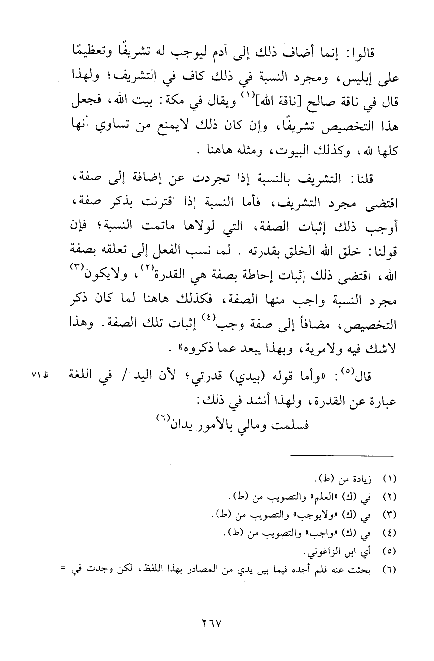 قلنا: التشريف بالنسبة إذا تجردت عن إضافة إلى صفة، اقتضى مجرد التشريف، فأما النسبة إذا اقترنت بذكر صفة، أوجب ذلك إثبات الصفة، التي لولاها ما تمت النسبة، فإن قولنا: خلق الله الخلق بقدرته. لما نسب الفعل إلى تعلقه بصفة الله، اقتضى ذلك إثبات إحاطة بصفة هي القدرة، ولا يكون مجرد النسبة واجب منها الصفة، فكذلك هاهنا لما كان ذكر التخصيص، مضافًا إلى صفة وجب إثبات تلك الصفة. وهذا لا شك فيه ولا مرية، وبهذا يبعد عما ذكروه» .