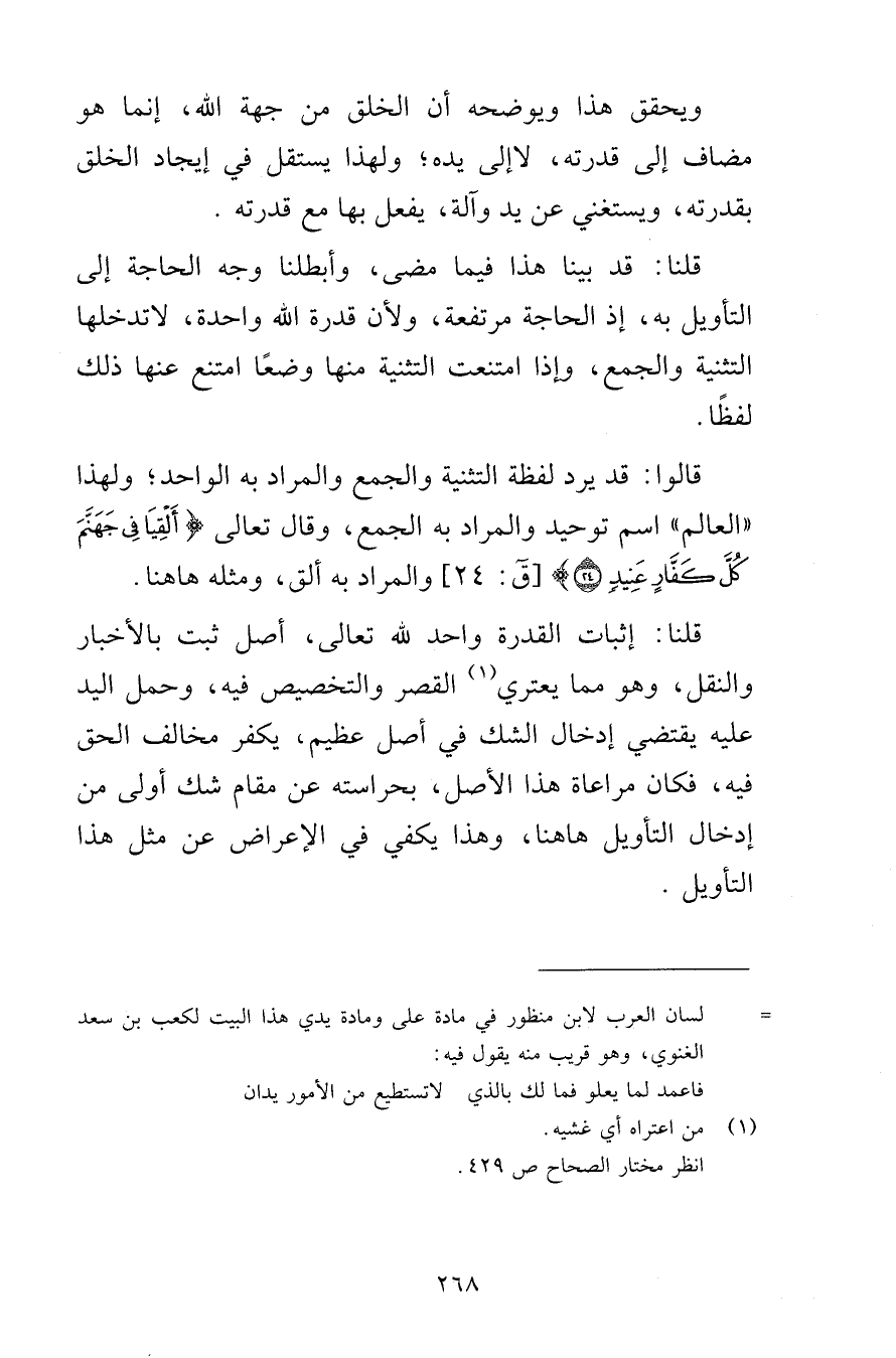قلنا: قد بينا هذا فيما مضى، وأبطلنا وجه الحاجة إلى التأويل به، إذ الحاجة مرتفعة، ولأن قدرة الله واحدة، لا تدخلها التثنية والجمع، وإذا امتنعت التثنية منها وضعًا امتنع عنها ذلك لفظًا.