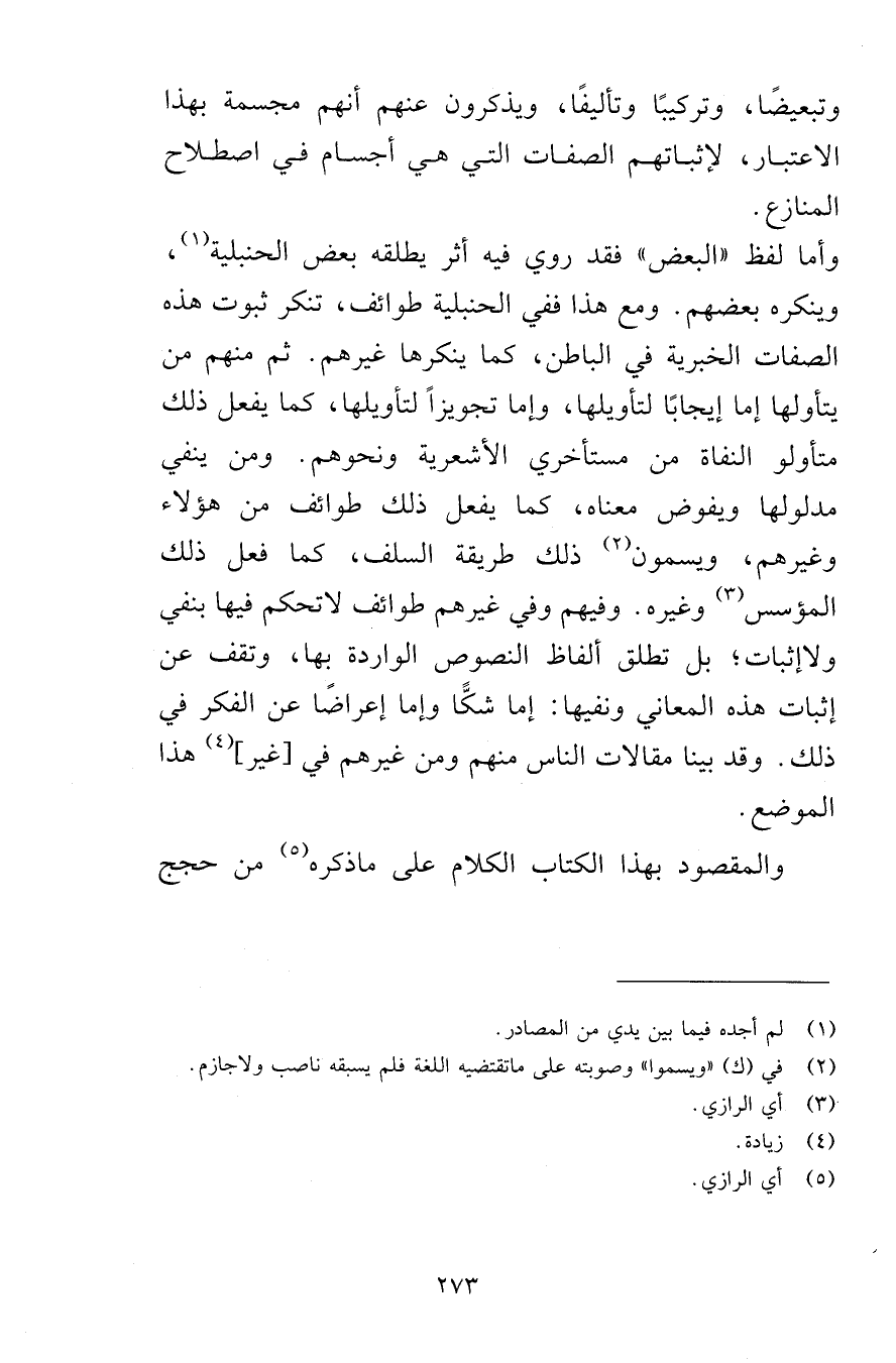 وأما لفظ «البعض» فقد روي فيه أثر يطلقه بعض الحنبلية، وينكره بعضهم. ومع هذا ففي الحنبلية طوائف، تنكر ثبوت هذه الصفات الخبرية في الباطن، كما ينكرها غيرهم. ثم منهم من يتأولها إما إيجابًا لتأويلها، وإما تجويزًا لتأويلها، كما يفعل ذلك متأولو النفاة من مستأخري الأشعرية ونحوهم. ومن ينفي مدلولها ويفوض معناه، كما يفعل ذلك طوائف من هؤلاء وغيرهم، ويسمون ذلك طريقة السلف، كما فعل ذلك المؤسس وغيره. وفيهم وفي غيرهم طوائف لا تحكم فيها بنفي ولا إثبات؛ بل تطلق ألفاظ النصوص الواردة بها، وتقف عن إثبات هذه المعاني ونفيها: إما شكًّا وإما إعراضًا عن الفكر في ذلك. وقد بينا مقالات الناس منهم ومن غيرهم في [غير] هذا الموضع.
