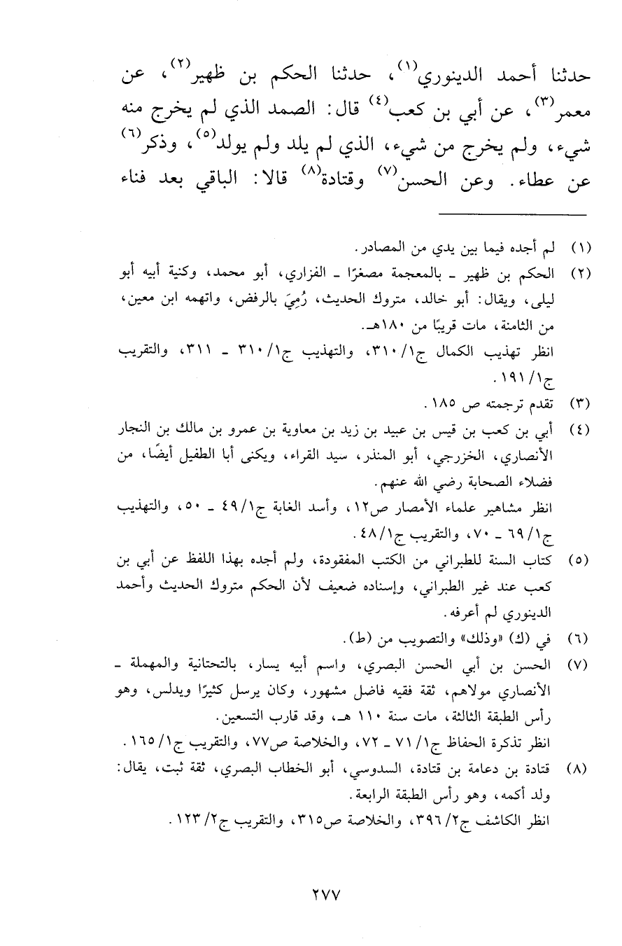 حدثنا أحمد الدينوري، حدثنا الحكم بن ظهير، عن معمر، عن أبي بن كعب قال: الصمد الذي لم يخرج منه شيء، ولم يخرج من شيء، الذي لم يلد ولم يولد، وذكر عن عطاء. وعن الحسن وقتادة قالا: الباقي بعد فناء