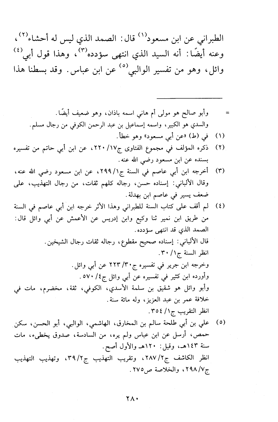 الطبراني عن ابن مسعود قال: الصمد الذي ليس له أحشاء، وعنه أيضًا: أنه السيد الذي انتهى سؤدده، وهذا قول أبي وائل، وهو من تفسير الوالبي عن ابن عباس. وقد بسطنا هذا