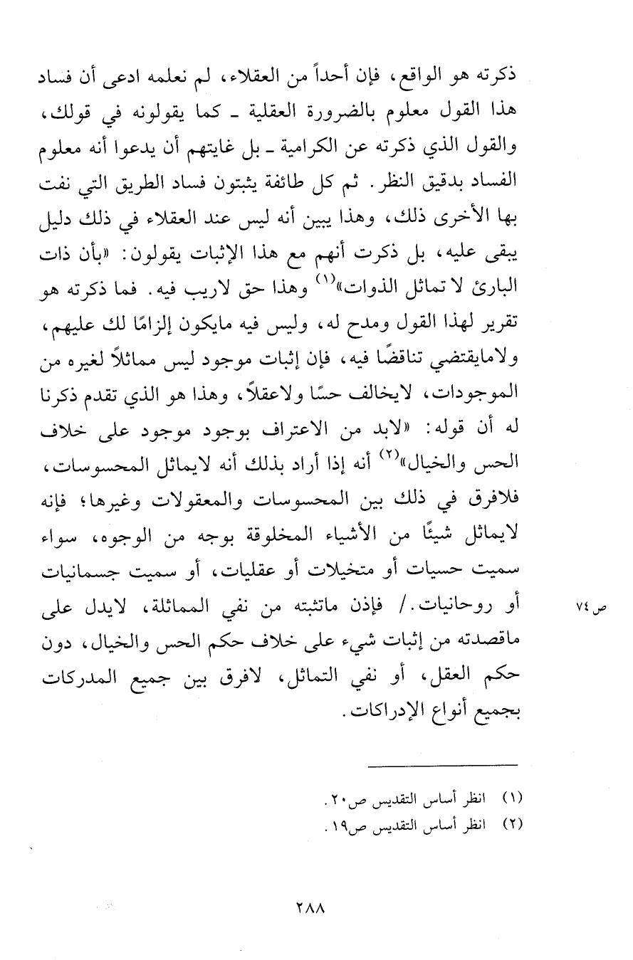 ذكرته هو الواقع، فإن أحدًا من العقلاء لم نعلمه ادعى أن فساد هذا القول معلوم بالضرورة العقلية -كما يقولونه في قولك، والقول الذي ذكرته عن الكرامية- بل غايتهم أن يدعوا أنه معلوم الفساد بدقيق النظر. ثم كل طائفة يثبتون فساد الطريق التي نفت بها الأخرى ذلك، وهذا يبين أنه ليس عند العقلاء في ذلك دليل يبقى عليه، بل ذكرت أنهم مع هذا الإثبات يقولون: «بأن ذات البارئ لا تماثل الذوات» وهذا حق لا ريب فيه. فما ذكرته هو تقرير لهذا القول ومدح له، وليس فيه ما يكون إلزامًا لك عليهم، ولا ما يقتضي تناقضًا فيه، فإن إثبات موجود ليس مماثلًا لغيره من الموجودات، لا يخالف حسًا ولا عقلًا، وهذا هو الذي تقدم ذكرنا له أن قوله: «لا بد من الاعتراف بوجود موجود على خلاف الحس والخيال» أنه إذا أراد بذلك أنه لا يماثل المحسوسات، فلا فرق في ذلك بين المحسوسات والمعقولات وغيرها؛ فإنه لا يماثل شيئًا من الأشياء المخلوقة بوجه من الوجوه، سواء سميت حسيات أو متخيلات أو عقليات، أو سميت جسمانيات أو روحانيات. فإذن ما تثبته من نفي المماثلة، لا يدل على ما قصدته من إثبات شيء على خلاف حكم الحس والخيال، دون حكم العقل، أو نفي التماثل، لا فرق بين جميع المدركات بجميع أنواع الإدراكات.