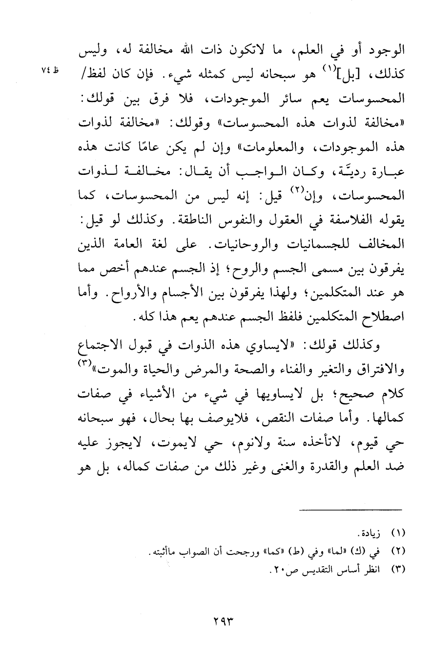 الوجود أو في العلم، ما لا تكون ذات الله مخالفة له، وليس كذلك، [بل] هو سبحانه ليس كمثله شيء. فإن كان لفظ المحسوسات يعم سائر الموجودات، فلا فرق بين قولك: «مخالفة لذوات هذه المحسوسات» وقولك: «مخالفة لذوات هذه الموجودات، والمعلومات» وإن لم يكن عامًّا كانت هذه عبارة رديَّة، وكان الواجب أن يقال: مخالفة لذوات المحسوسات، وإن قيل: إنه ليس من المحسوسات، كما يقول الفلاسفة في العقول والنفوس الناطقة. وكذلك لو قيل: المخالف للجسمانيات والروحانيات. على لغة العامة الذين يفرقون بين مسمى الجسم والروح؛ إذ الجسم عندهم أخص مما هو عند المتكلمين؛ ولهذا يفرقون بين الأجسام والأرواح. وأما اصطلاح المتكلمين فلفظ الجسم عندهم يعم هذا كله.