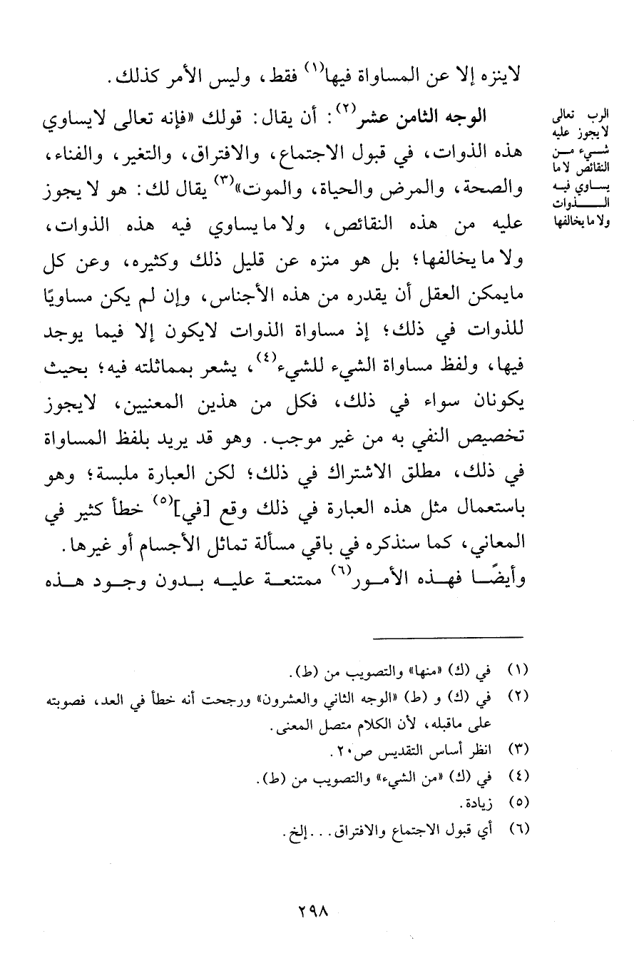 الوجه الثامن عشر: أن يقال: قولك «فإنه تعالى لا يساوي هذه الذوات، في قبول الاجتماع، والافتراق، والتغير، والفناء، والصحة، والمرض، والحياة، والموت» يقال لك: هو لا يجوز عليه من هذه النقائص، ولا ما يساوي فيه هذه الذوات، ولا ما يخالفها؛ بل هو منزه عن قليل ذلك وكثيره، وعن كل ما يمكن العقل أن يقدره من هذه الأجناس، وإن لم يكن مساويًا للذوات في ذلك؛ إذ مساواة الذوات لا يكون إلا فيما يوجد فيها، ولفظ مساواة الشيء للشيء، يشعر بمماثلته فيه؛ بحيث يكونان سواء في ذلك، فكل من هذين المعنيين، لا يجوز تخصيص النفي به من غير موجب. وهو قد يريد بلفظ المساواة في ذلك، مطلق الاشتراك في ذلك؛ لكن العبارة ملبسة؛ وهو باستعمال مثل هذه العبارة في ذلك وقع [في] خطأ كثير في المعاني، كما سنذكره في باقي مسألة تماثل الأجسام أو غيرها. وأيضًا فهذه الأمور ممتنعة عليه بدون وجود هذه