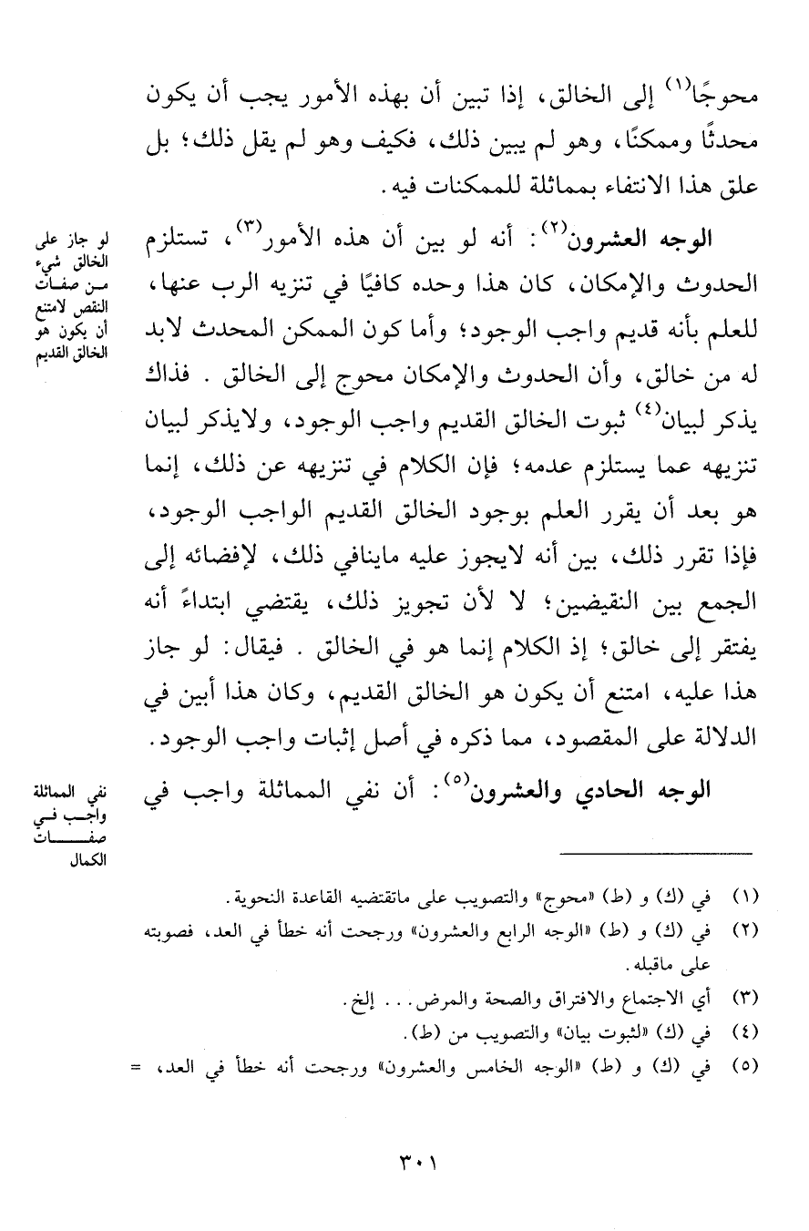 الوجه العشرون: أنه لو بين أن هذه الأمور، تستلزم الحدوث والإمكان، كان هذا وحده كافيًا في تنزيه الرب عنها، للعلم بأنه قديم واجب الوجود؛ وأما كون الممكن المحدث لا بد له من خالق، وأن الحدوث والإمكان محوج إلى الخالق. فذاك يذكر لبيان ثبوت الخالق القديم واجب الوجود، ولا يذكر لبيان تنزيهه عما يستلزم عدمه؛ فإن الكلام في تنزيهه عن ذلك، إنما هو بعد أن يقرر العلم بوجود الخالق القديم الواجب الوجود، فإذا تقرر ذلك، بين أنه لا يجوز عليه ما ينافي ذلك، لإفضائه إلى الجمع بين النقيضين؛ لا لأن تجويز ذلك، يقتضي ابتداءً أنه يفتقر إلى خالق؛ إذ الكلام إنما هو في الخالق. فيقال: لو جاز هذا عليه، امتنع أن يكون هو الخالق القديم، وكان هذا أبين في الدلالة على المقصود، مما ذكره في أصل إثبات واجب الوجود.