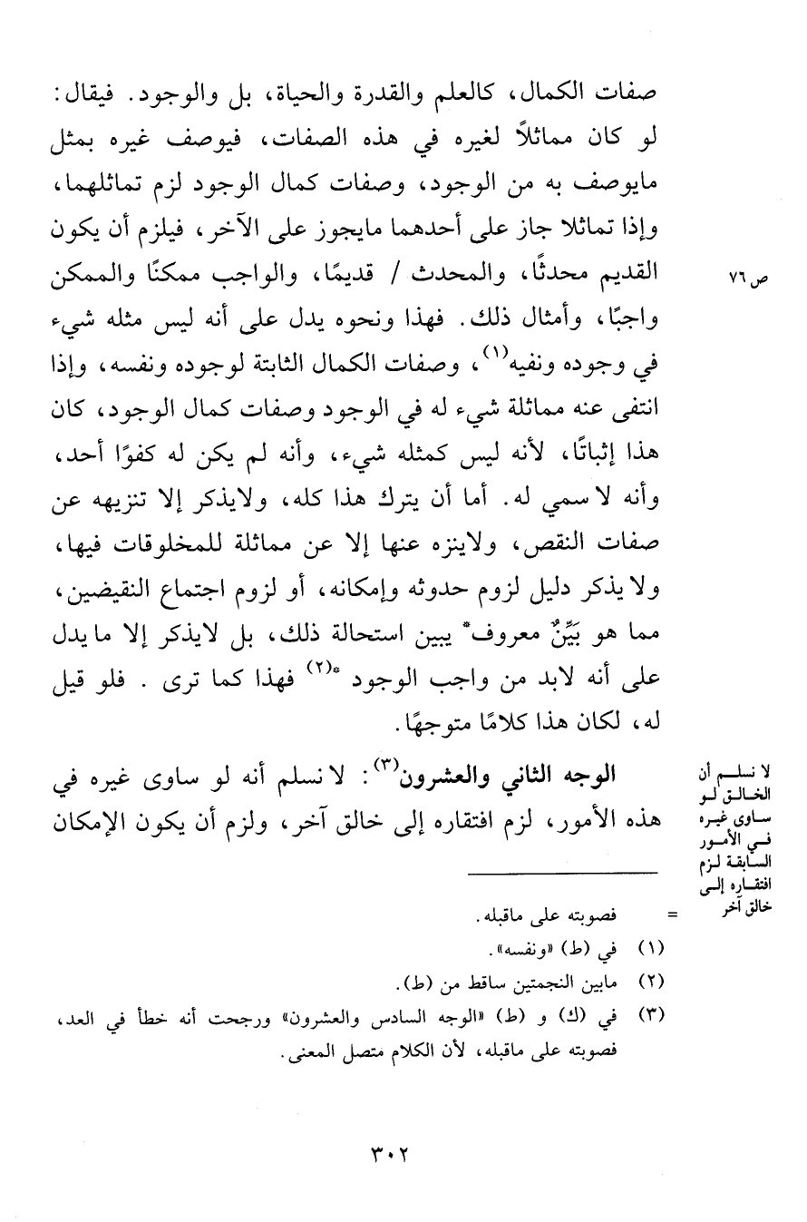 صفات الكمال، كالعلم والقدرة والحياة، بل والوجود. فيقال: لو كان مماثلًا لغيره في هذه الصفات، فيوصف غيره بمثل ما يوصف به من الوجود، وصفات كمال الوجود لزم تماثلهما، وإذا تماثلا جاز على أحدهما ما يجوز على الآخر، فيلزم أن يكون القديم محدثًا، والمحدث قديمًا، والواجب ممكنًا والممكن واجبًا، وأمثال ذلك. فهذا ونحوه يدل على أنه ليس مثله شيء في وجوده ونفيه، وصفات الكمال الثابتة لوجوده ونفسه، وإذا انتفى عنه مماثلة شيء له في الوجود وصفات كمال الوجود، كان هذا إثباتًا، لأنه ليس كمثله شيء، وأنه لم يكن له كفوًا أحد، وأنه لا سمي له. أما أن يترك هذا كله ولا يذكر إلا تنزيهه عن صفات النقص، ولا ينزه عنها إلا عن مماثلة للمخلوقات فيها، ولا يذكر دليل لزوم حدوثه وإمكانه، أو لزوم اجتماع النقيضين، مما هو بَيِّنٌ معروف *يبين استحالة ذلك، بل لا يذكر إلا ما يدل على أنه لا بد من واجب الوجود* فهذا كما ترى. فلو قيل له، لكان هذا كلامًا متوجهًا.