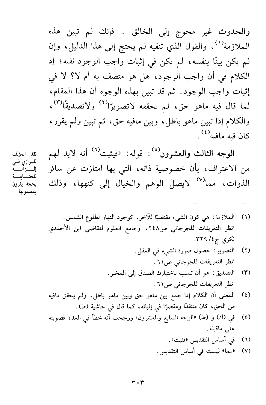 والحدوث غير محوج إلى الخالق. فإنك لم تبين هذه الملازمة، والقول الذي تنفيه لم يحتج إلى هذا الدليل، وإن لم يكن بينًا بنفسه، لم يكن في إثبات واجب الوجود نفيه؛ إذ الكلام في أن واجب الوجود، هل هو متصف به أم لا؟ لا في إثبات واجب الوجود. ثم قد تبين بهذه الوجوه أن هذا المقام، لما قال فيه ما هو حق، لم يحققه لا تصويرًا ولا تصديقًا، والكلام إذا تبين ما هو باطل، وبين ما فيه حق، ثم تبين ولم يقرر، كان فيه ما فيه.