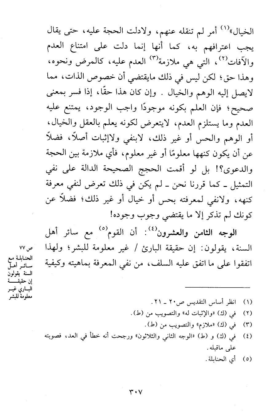 الخيال» أمر لم تنقله عنهم، ولا دلت الحجة عليه، حتى يقال يجب اعترافهم به، كما أنها إنما دلت على امتناع العدم والآفات، التي هي ملازمة العدم عليه، كالمرض ونحوه، وهذا حق؛ لكن ليس في ذلك ما يقتضي أن خصوص الذات، مما لا يصل إليه الوهم والخيال. وإن كان هذا حقًّا، إذا فسر بمعنى صحيح؛ فإن العلم بكونه موجودًا واجب الوجود، يمتنع عليه العدم وما يستلزم العدم، لا يتعرض لكونه يعقل بالعقل والخيال، أو الوهم والحس أو غير ذلك، لا بنفي ولا إثبات أصلًا، فضلًا عن أن يكون كنهها معلومًا أو غير معلوم، فأي ملازمة بين الحجة والدعوى؟! بل لو أقمت الحجج الصحيحة الدالة على نفي التمثيل -كما قررنا نحن- لم يكن في ذلك تعرض لنفي معرفة كنهه، ولا نفي لمعرفته بحس أو خيال أو غير ذلك؛ فضلًا عن كونك لم تذكر إلا ما يقتضي وجوب وجوده!