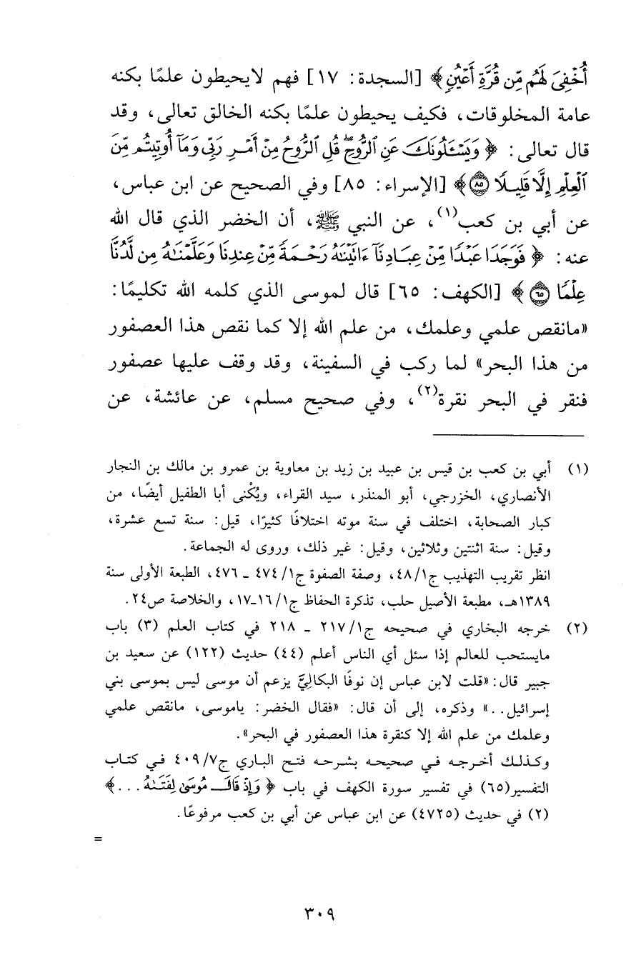 أُخْفِيَ لَهُم مِّن قُرَّةِ أَعْيُنٍ} [السجدة: 17] فهم لا يحيطون علمًا بكنه عامة المخلوقات، فكيف يحيطون علمًا بكنه الخالق تعالى، وقد قال تعالى: {وَيَسْأَلُونَكَ عَنِ الرُّوحِ قُلِ الرُّوحُ مِنْ أَمْرِ رَبِّي وَمَا أُوتِيتُم مِّنَ الْعِلْمِ إِلَّا قَلِيلًا (85) } [الإسراء: 85] وفي الصحيح عن ابن عباس، عن أبي بن كعب، عن النبي صلى الله عليه وسلم، أن الخضر الذي قال الله عنه: {فَوَجَدَا عَبْدًا مِّنْ عِبَادِنَا آتَيْنَاهُ رَحْمَةً مِّنْ عِندِنَا وَعَلَّمْنَاهُ مِن لَّدُنَّا عِلْمًا (65) } [الكهف: 65] قال لموسى الذي كلمه الله تكليمًا: «ما نقص علمي وعلمك، من علم الله إلا كما نقص هذا العصفور من هذا البحر» لما ركب في السفينة، وقد وقف عليها عصفور فنقر في البحر نقرة، وفي صحيح مسلم، عن عائشة، عن