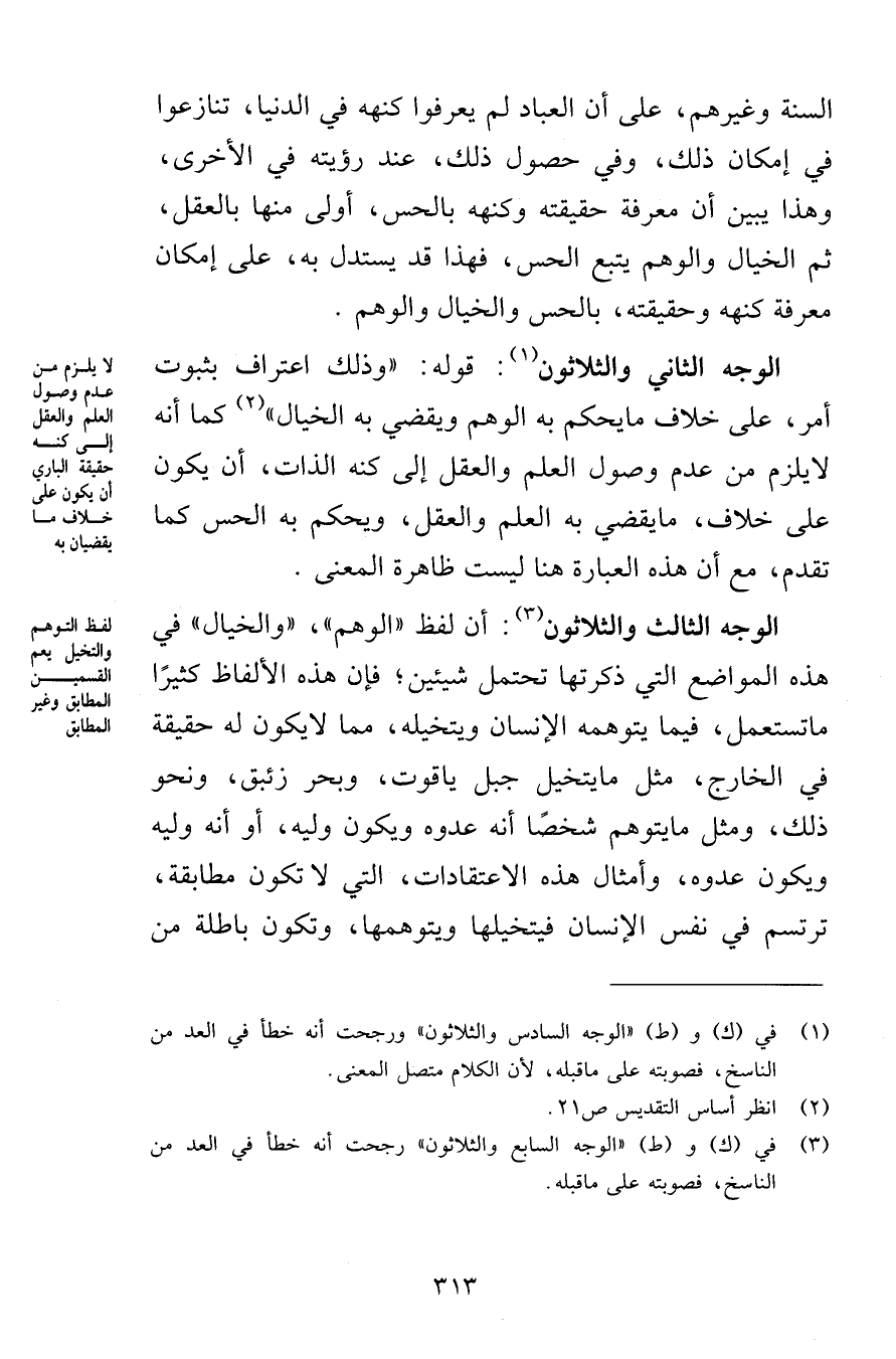 الوجه الثالث والثلاثون: أن لفظ «الوهم» ، و «الخيال» في هذه المواضع التي ذكرتها تحتمل شيئين؛ فإن هذه الألفاظ كثيرًا ما تستعمل، فيما يتوهمه الإنسان ويتخيله، مما لا يكون له حقيقة في الخارج، مثل ما يتخيل جبل ياقوت، وبحر زئبق، ونحو ذلك، ومثل ما يتوهم شخصًا أنه عدوه ويكون وليه، أو أنه وليه ويكون عدوه، وأمثال هذه الاعتقادات، التي لا تكون مطابقة، ترتسم في نفس الإنسان فيتخيلها ويتوهمها، وتكون باطلة من