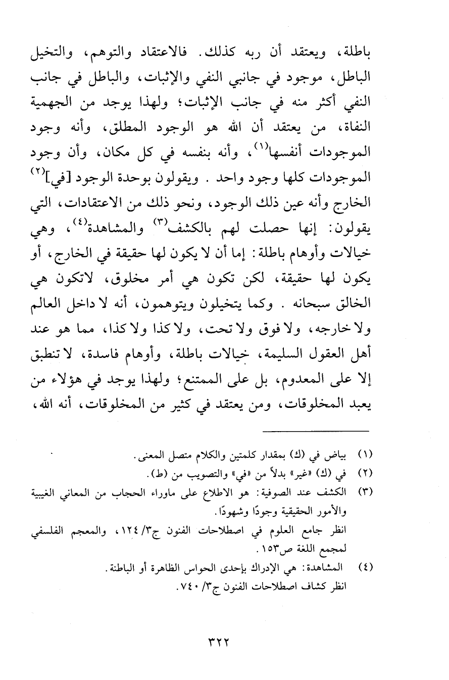 باطلة، ويعتقد أن ربه كذلك. فالاعتقاد والتوهم، والتخيل الباطل، موجود في جانبي النفي والإثبات، والباطل في جانب النفي أكثر منه في جانب الإثبات؛ ولهذا يوجد من الجهمية النفاة، من يعتقد أن الله هو الوجود المطلق، وأنه وجود الموجودات أنفسها، وأنه بنفسه في كل مكان، وأن وجود الموجودات كلها وجود واحد. ويقولون بوحدة الوجود [في] الخارج وأنه عين ذلك الوجود، ونحو ذلك من الاعتقادات، التي يقولون: إنها حصلت لهم بالكشف والمشاهدة، وهي خيالات وأوهام باطلة: إما أن لا يكون لها حقيقة في الخارج، أو يكون لها حقيقة، لكن تكون هي أمر مخلوق، لا تكون هي الخالق سبحانه. وكما يتخيلون ويتوهمون، أنه لا داخل العالم ولا خارجه، ولا فوق ولا تحت، ولا كذا ولا كذا، مما هو عند أهل العقول السليمة خيالات باطلة، وأوهام فاسدة، لا تنطبق إلا على المعدوم، بل على الممتنع؛ ولهذا يوجد في هؤلاء من يعبد المخلوقات، ومن يعتقد في كثير من المخلوقات، أنه الله،