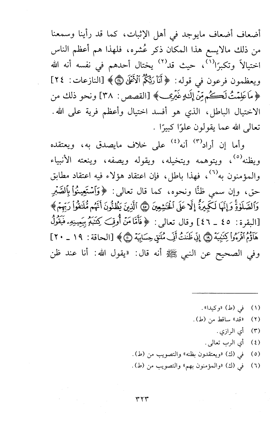 وأما إن أراد أنه على خلاف ما يصدق به، ويعتقده ويظنه، ويتوهمه ويتخيله، ويقوله ويصفه، وينعته الأنبياء والمؤمنون به، فهذا باطل، فإن اعتقاد هؤلاء فيه اعتقاد مطابق حق، وإن سمي ظنًّا ونحوه، كما قال تعالى: {وَاسْتَعِينُوا بِالصَّبْرِ وَالصَّلَاةِ وَإِنَّهَا لَكَبِيرَةٌ إِلَّا عَلَى الْخَاشِعِينَ (45) الَّذِينَ يَظُنُّونَ أَنَّهُم مُّلَاقُوا رَبِّهِمْ} [البقرة: 45-46] وقال تعالى: {فَأَمَّا مَنْ أُوتِيَ كِتَابَهُ بِيَمِينِهِ فَيَقُولُ هَاؤُمُ اقْرَءُوا كِتَابِيَهْ (19) إِنِّي ظَنَنتُ أَنِّي مُلَاقٍ حِسَابِيَهْ (20) [الحاقة: 19-20] وفي الصحيح عن النبي صلى الله عليه وسلم أنه قال: «يقول الله: أنا عند ظن