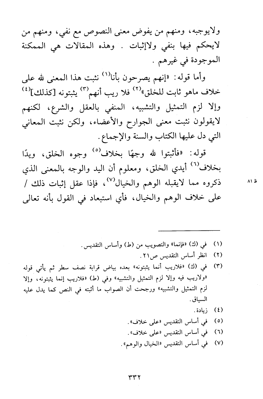 قوله: «فأثبتوا لله وجهًا بخلاف وجوه الخلق، ويدًا بخلاف أيدي الخلق، ومعلوم أن اليد والوجه بالمعنى الذي ذكروه مما لا يقبله الوهم والخيال، فإذا عقل إثبات ذلك على خلاف الوهم والخيال، فأي استبعاد في القول بأنه تعالى