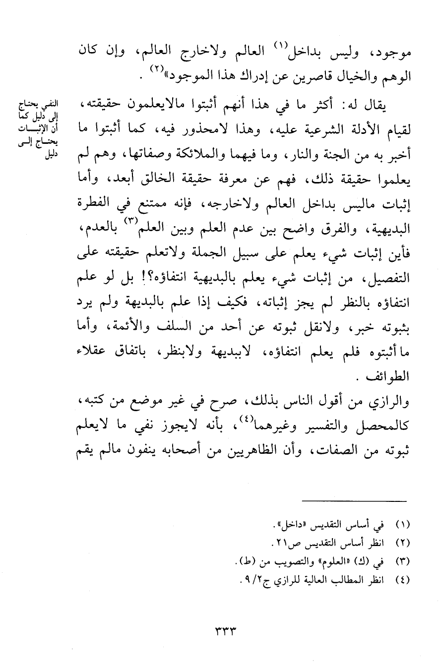 والرازي من أقول الناس بذلك، صرح في غير موضع من كتبه، كالمحصل والتفسير وغيرهما، بأنه لا يجوز نفي ما لا يعلم ثبوته من الصفات، وأن الظاهريين من أصحابه ينفون ما لم يقم