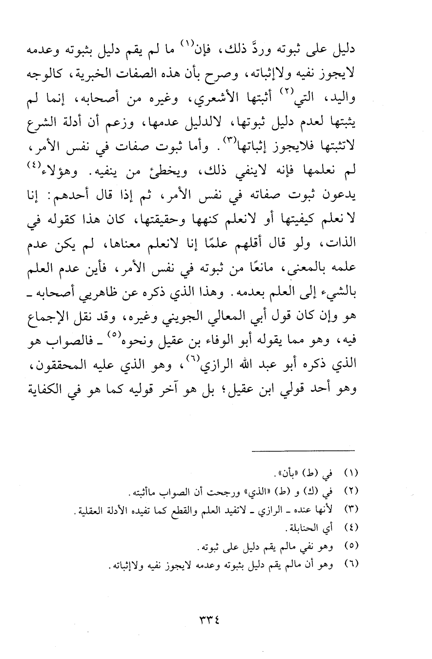 دليل على ثبوته وردَّ ذلك، فإن ما لم يقم دليل بثبوته وعدمه لا يجوز نفيه ولا إثباته، وصرح بأن هذه الصفات الخبرية، كالوجه واليد، التي أثبتها الأشعري، وغيره من أصحابه، إنما لم يثبتها لعدم دليل ثبوتها، لا لدليل عدمها، وزعم أن أدلة الشرع لا تثبتها فلا يجوز إثباتها. وأما ثبوت صفات في نفس الأمر، لم نعلمها فإنه لا ينفي ذلك، ويخطئ من ينفيه. وهؤلاء يدعون ثبوت صفاته في نفس الأمر، ثم إذا قال أحدهم: إنا لا نعلم كيفيتها أو لا نعلم كنهها وحقيقتها، كان هذا كقوله في الذات، ولو قال أقلهم علمًا إنا لا نعلم معناها، لم يكن عدم علمه بالمعنى، مانعًا من ثبوته في نفس الأمر، فأين عدم العلم بالشيء إلى العلم بعدمه. وهذا الذي ذكره عن ظاهريي أصحابه -هو وإن كان قول أبي المعالي الجويني وغيره، وقد نقل الإجماع فيه، وهو مما يقوله أبو الوفاء بن عقيل ونحوه- فالصواب هو الذي ذكره أبو عبد الله الرازي، وهو الذي عليه المحققون، وهو أحد قولي ابن عقيل؛ بل هو آخر قوليه كما هو في الكفاية