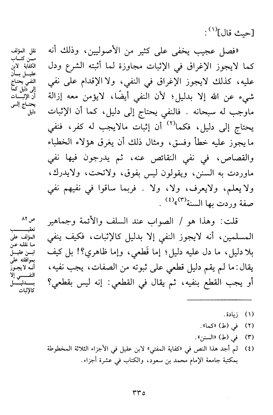 «فصل عجيب يخفى على كثير من الأصوليين، وذلك أنه كما لا يجوز الإغراق في الإثبات مجاوزة لما أثبته الشرع ودل عليه، كذلك لا يجوز الإغراق في النفي، ولا الإقدام على نفي شيء عن الله إلا بدليل؛ لأن النفي أيضًا، لا يؤمن معه إزالة ما وجب له سبحانه. فالنفي يحتاج إلى دليل، كما أن الإثبات يحتاج إلى دليل، فكما أن إثبات ما لا يجب له كفر، فنفي ما يجوز عليه خطأ وفسق، ومثال ذلك أن يغرق هؤلاء الخطباء والقصاص، في نفي النقائص عنه، ثم يدرجون فيها نفي ما وردت به السنن، ويقولون ليس بفوق، ولا تحت، ولا يدرك، ولا يعلم، ولا يعرف، ولا، ولا. فربما ساقوا في نفيهم نفي صفة وردت بها السنة» .