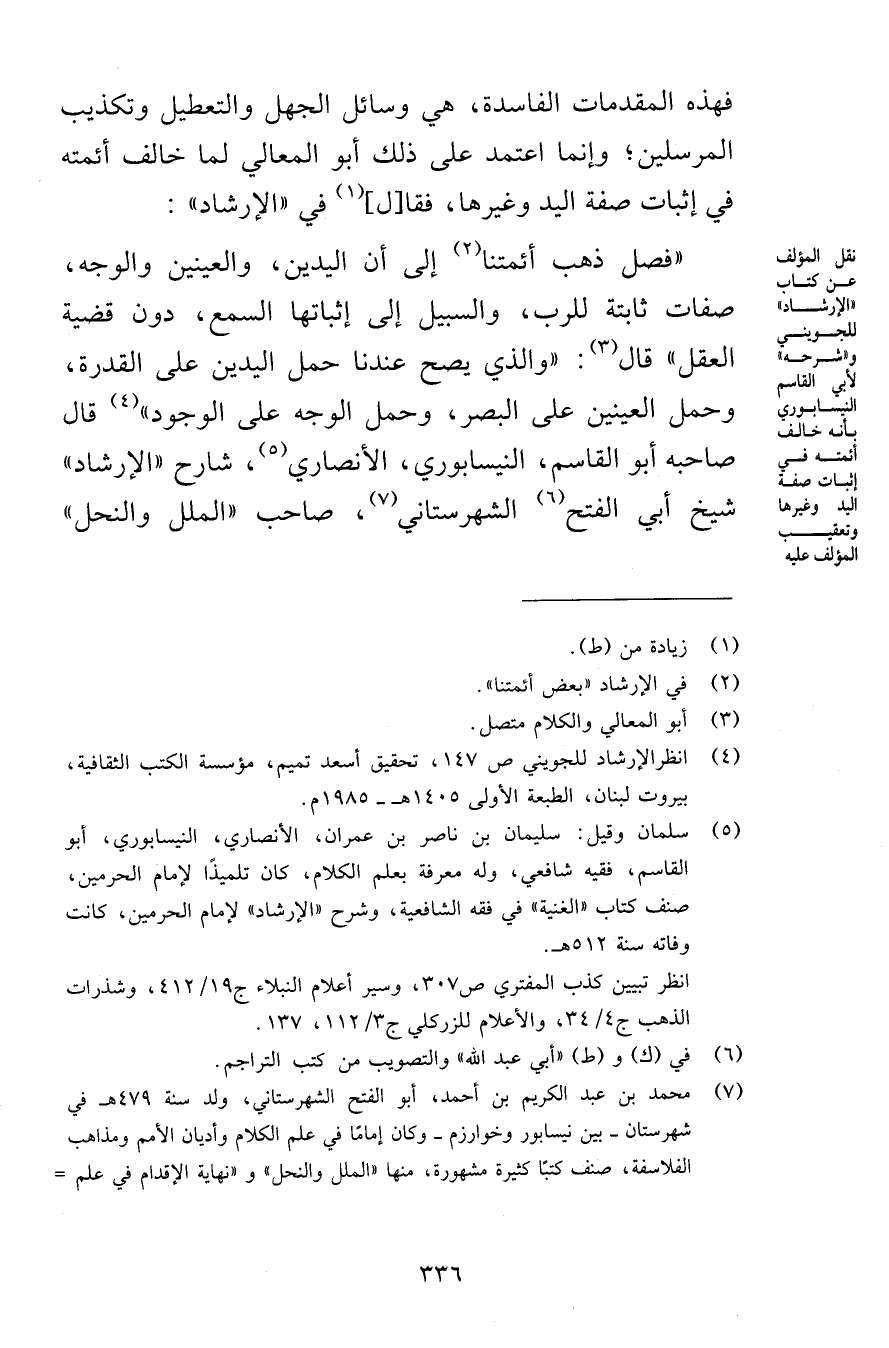 «فصل ذهب أئمتنا إلى أن اليدين، والعينين والوجه، صفات ثابتة للرب، والسبيل إلى إثباتها السمع، دون قضية العقل» قال: «والذي يصح عندنا حمل اليدين على القدرة، وحمل العينين على البصر، وحمل الوجه على الوجود» قال صاحبه أبو القاسم، النيسابوري، الأنصاري، شارح «الإرشاد» شيخ أبي الفتح الشهرستاني، صاحب «الملل والنحل»
