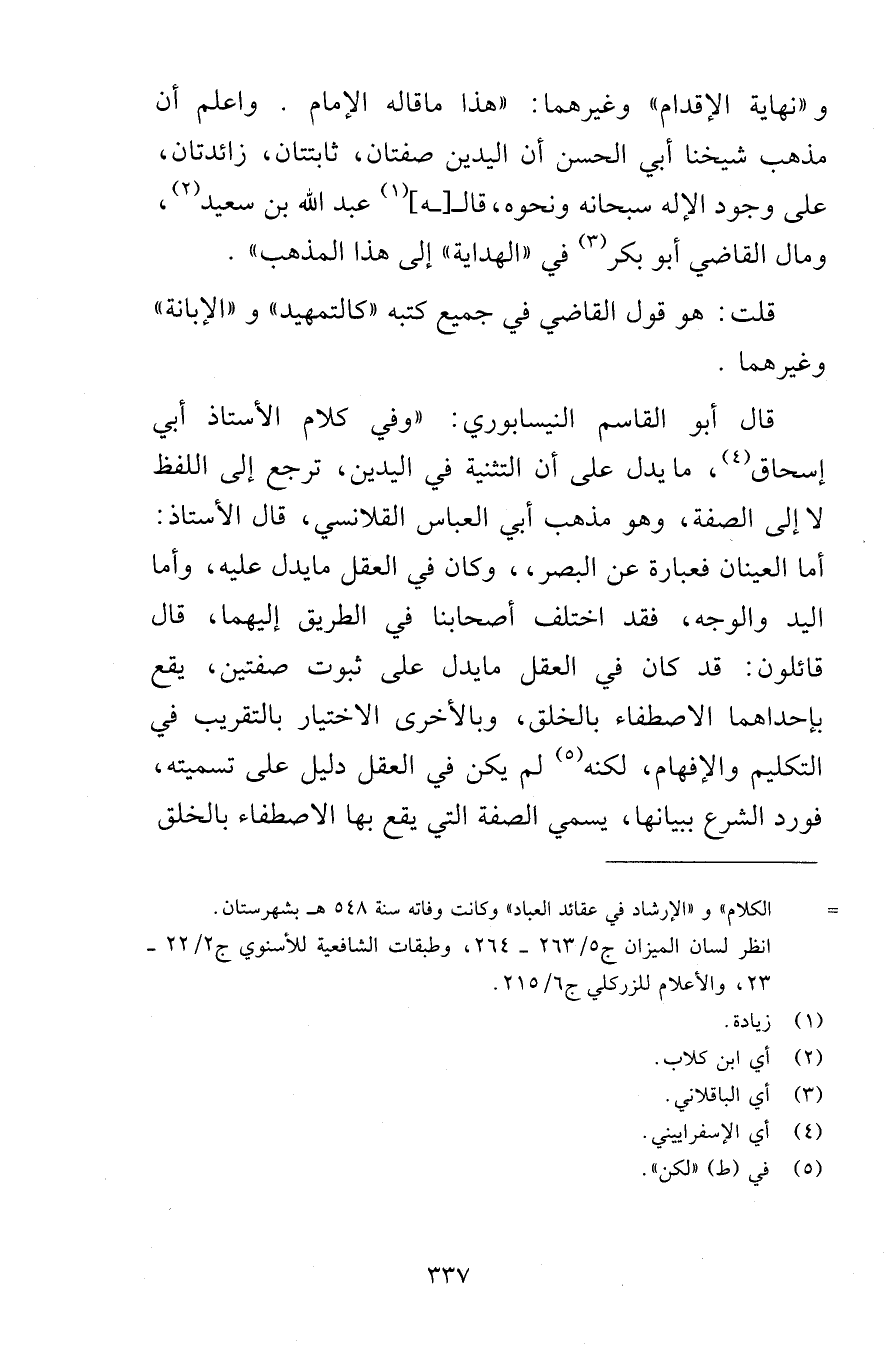 و «نهاية الإقدام» وغيرهما: «هذا ما قاله الإمام. واعلم أن مذهب شيخنا أبي الحسن أن اليدين صفتان، ثابتتان، زائدتان، على وجود الإله سبحانه ونحوه، قالـ[ـه] عبد الله بن سعيد، ومال القاضي أبو بكر في «الهداية» إلى هذا المذهب» .