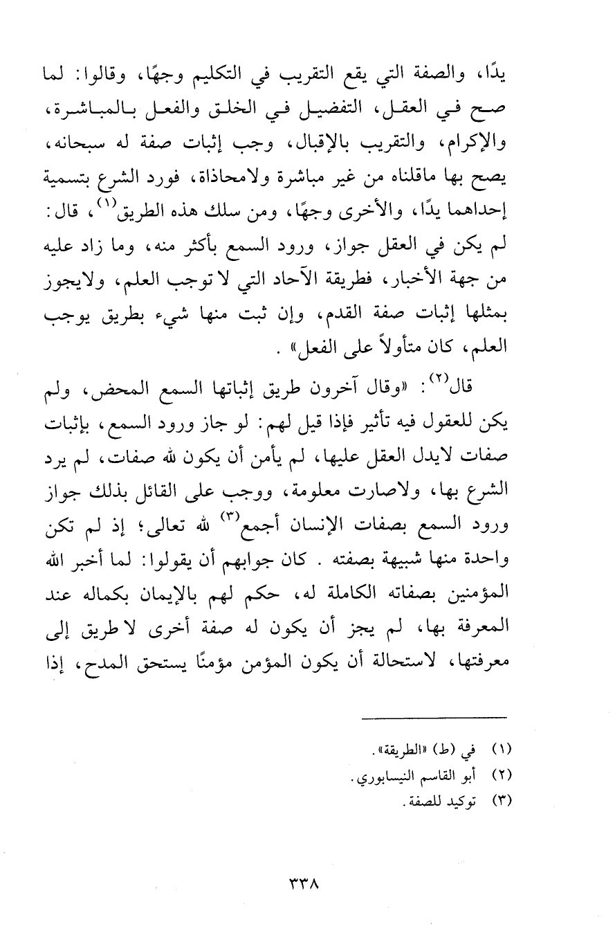 يدًا، والصفة التي يقع التقريب في التكليم وجهًا، وقالوا: لما صح في العقل، التفضيل في الخلق والفعل بالمباشرة، والإكرام، والتقريب بالإقبال، وجب إثبات صفة له سبحانه، يصح بها ما قلناه من غير مباشرة ولا محاذاة، فورد الشرع بتسمية إحداهما يدًا، والأخرى وجهًا، ومن سلك هذه الطريق، قال: لم يكن في العقل جواز، ورود السمع بأكثر منه، وما زاد عليه من جهة الأخبار، فطريقة الآحاد التي لا توجب العلم، ولا يجوز بمثلها إثبات صفة القدم، وإن ثبت منها شيء بطريق يوجب العلم، كان متأولًا على الفعل» .