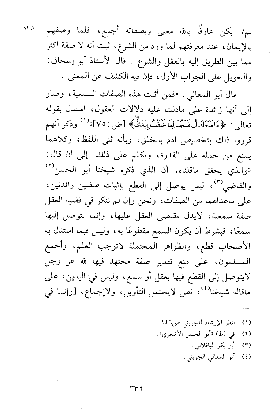 قال أبو المعالي: «فمن أثبت هذه الصفات السمعية، وصار إلى أنها زائدة على ما دلت عليه دلالات العقول، استدل بقوله تعالى: {مَا مَنَعَكَ أَن تَسْجُدَ لِمَا خَلَقْتُ بِيَدَيَّ} [ص: 75] » وذكر أنهم قرروا ذلك بتخصيص آدم بالخلق، وبأنه ثنى اللفظ، وكلاهما يمنع من حمله على القدرة، وتكلم على ذلك إلى أن قال: «والذي يحقق ما قلناه، أن الذي ذكره شيخنا أبو الحسن والقاضي، ليس يوصل إلى القطع بإثبات صفتين زائدتين، على ما عداهما من الصفات، ونحن وإن لم ننكر في قضية العقل صفة سمعية، لا يدل مقتضى العقل عليها، وإنما يتوصل إليها سمعًا، فبشرط أن يكون السمع مقطوعًا به، وليس فيما استدل به الأصحاب قطع، والظواهر المحتملة لا توجب العلم، وأجمع المسلمون، على منع تقدير صفة مجتهد فيها لله عز وجل لا يتوصل إلى القطع فيها بعقل أو سمع، وليس في اليدين، على ما قاله شيخنا، نص لا يحتمل التأويل، ولا إجماع، [وإنما في