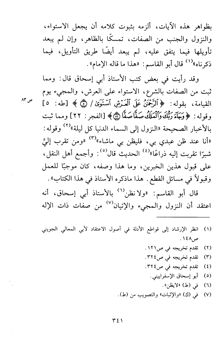 قال أبو القاسم: «ولا نظن بالأستاذ أبي إسحاق، أنه اعتقد أن النزول والمجيء والإتيان من صفات ذات الإله