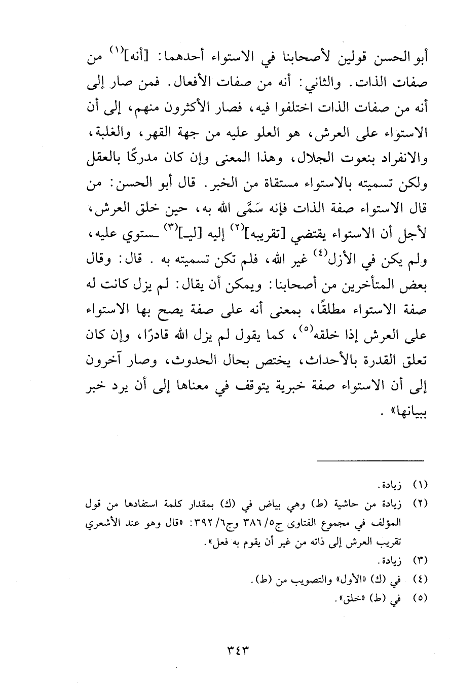أبو الحسن قولين لأصحابنا في الاستواء أحدهما: [أنه] من صفات الذات. والثاني: أنه من صفات الأفعال. فمن صار إلى أنه من صفات الذات اختلفوا فيه، فصار الأكثرون منهم، إلى أن الاستواء على العرش، هو العلو عليه من جهة القهر، والغلبة، والانفراد بنعوت الجلال، وهذا المعنى وإن كان مدركًا بالعقل ولكن تسميته بالاستواء مستقاة من الخبر. قال أبو الحسن: من قال الاستواء صفة الذات فإنه سَمَّى الله به، حين خلق العرش، لأجل أن الاستواء يقتضي [تقريبه] إليه [ليـ]ـستوي عليه، ولم يكن في الأزل غير الله، فلم تكن تسميته به. قال: وقال بعض المتأخرين من أصحابنا: ويمكن أن يقال: لم يزل كانت له صفة الاستواء مطلقًا، بمعنى أنه على صفة يصح بها الاستواء على العرش إذا خلقه، كما يقول لم يزل الله قادرًا، وإن كان تعلق القدرة بالأحداث، يختص بحال الحدوث، وصار آخرون إلى أن الاستواء صفة خبرية يتوقف معناها إلى أن يرد خبر ببيانها» .