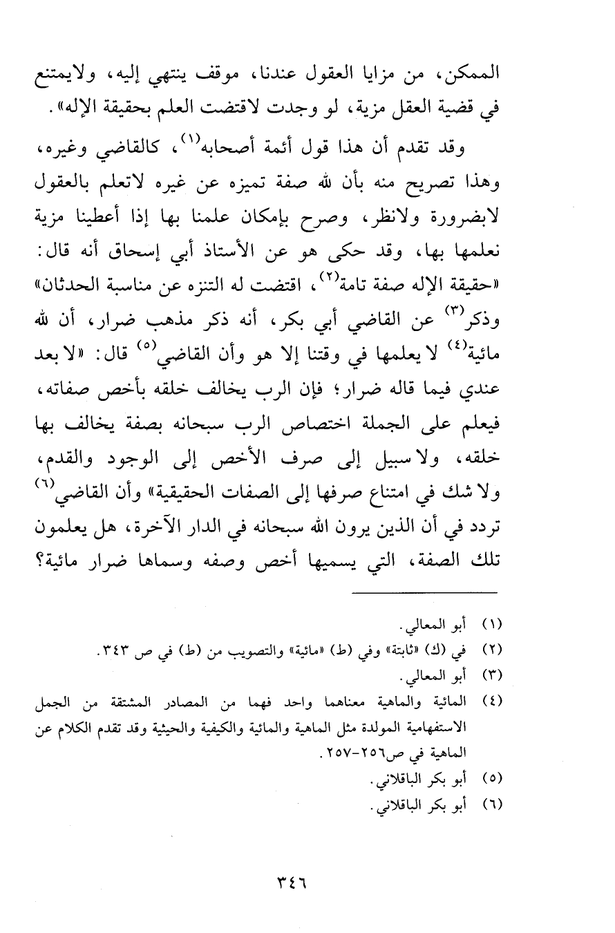 وقد تقدم أن هذا قول أئمة أصحابه، كالقاضي وغيره، وهذا تصريح منه بأن لله صفة تميزه عن غيره لا تعلم بالعقول لا بضرورة ولا نظر، وصرح بإمكان علمنا بها إذا أعطينا مزية نعلمها بها، وقد حكى هو عن الأستاذ أبي إسحاق أنه قال: «حقيقة الإله صفة تامة، اقتضت له التنزه عن مناسبة الحدثان» وذكر عن القاضي أبي بكر، أنه ذكر مذهب ضرار، أن لله مائية لا يعلمها في وقتنا إلا هو وأن القاضي قال: «لا بعد عندي فيما قاله ضرار؛ فإن الرب يخالف خلقه بأخص صفاته، فيعلم على الجملة اختصاص الرب سبحانه بصفة يخالف بها خلقه، ولا سبيل إلى صرف الأخص إلى الوجود والقدم، ولا شك في امتناع صرفها إلى الصفات الحقيقية» وأن القاضي تردد في أن الذين يرون الله سبحانه في الدار الآخرة، هل يعلمون تلك الصفة، التي يسميها أخص وصفه وسماها ضرار مائية؟