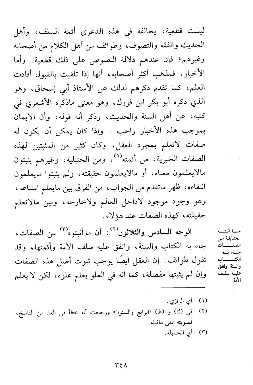 ليست قطعية، يخالفه في هذه الدعوى أئمة السلف، وأهل الحديث والفقه والتصوف، وطوائف من أهل الكلام من أصحابه وغيرهم؛ فإن عندهم دلالة النصوص على ذلك قطعية. وأما الأخبار، فمذهب أكثر أصحابه، أنها إذا تلقيت بالقبول أفادت العلم، كما تقدم ذكرهم لذلك عن الأستاذ أبي إسحاق، وهو الذي ذكره أبو بكر ابن فورك، وهو معنى ما ذكره الأشعري في كتبه، عن أهل السنة والحديث، وذكر أنه قوله، وأن الإيمان بموجب هذه الأخبار واجب. وإذا كان يمكن أن يكون له صفات لا تعلم بمجرد العقل، وكان كثير من المثبتين لهذه الصفات الخبرية، من أئمته، ومن الحنبلية، وغيرهم يثبتون ما لا يعلمون معناه، أو ما لا يعلمون حقيقته، ولم يثبتوا ما يعلمون انتفاءه، ظهر ما تقدم من الجواب، من الفرق بين ما يعلم امتناعه، وهو وجود موجود لا داخل العالم ولا خارجه، وبينه ما لا تعلم حقيقته، كهذه الصفات عند هؤلاء.