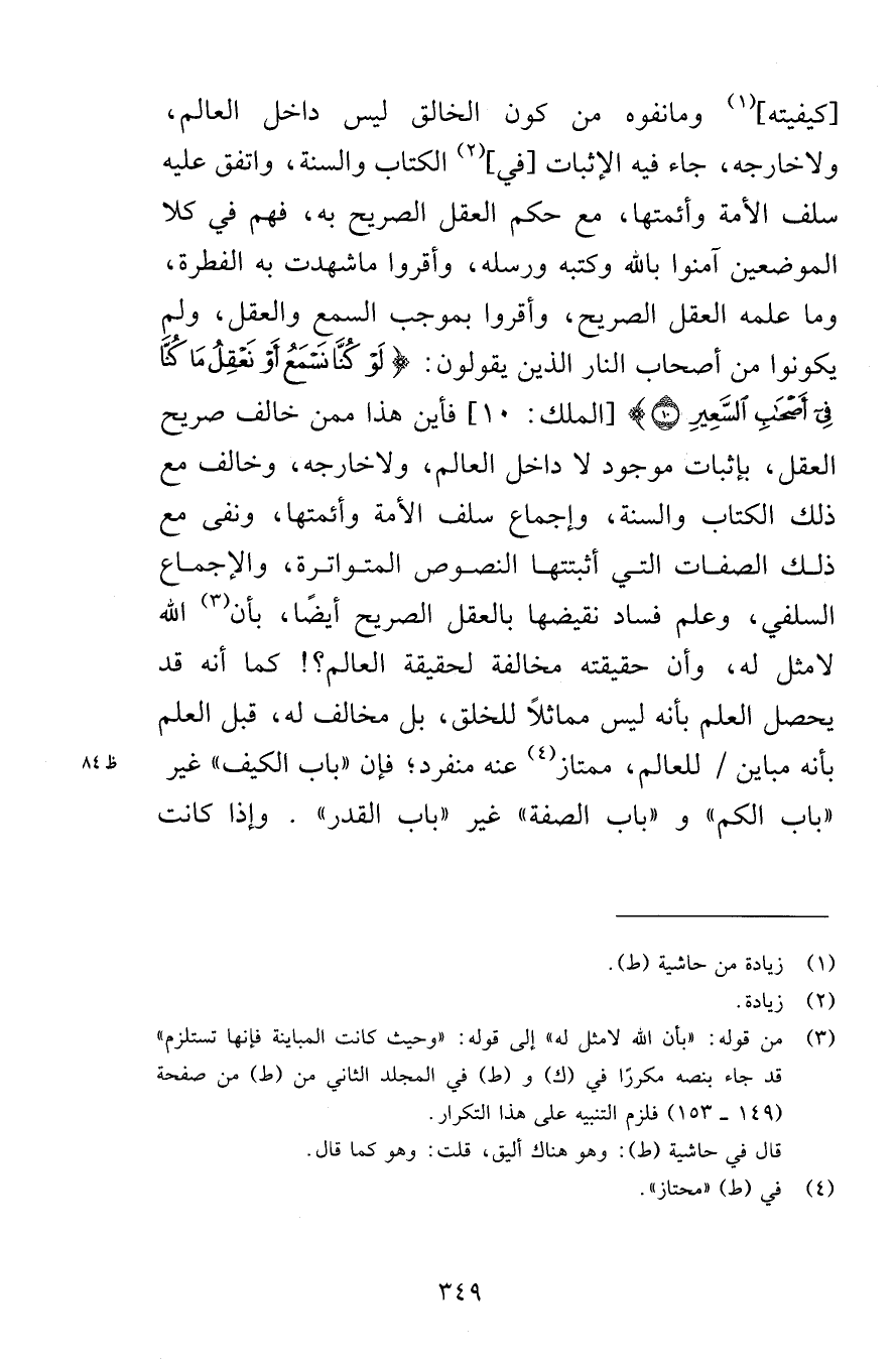 [كيفيته] وما نفوه من كون الخالق ليس داخل العالم، ولا خارجه، جاء فيه الإثبات [في] الكتاب والسنة، واتفق عليه سلف الأمة وأئمتها، مع حكم العقل الصريح به، فهم في كلا الموضعين آمنوا بالله وكتبه ورسله، وأقروا ما شهدت به الفطرة، وما علمه العقل الصريح، وأقروا بموجب السمع والعقل، ولم يكونوا من أصحاب النار الذين يقولون: {لَوْ كُنَّا نَسْمَعُ أَوْ نَعْقِلُ مَا كُنَّا فِي أَصْحَابِ السَّعِيرِ (10) } [الملك: 10] فأين هذا ممن خالف صريح العقل، بإثبات موجود لا داخل العالم، ولا خارجه، وخالف مع ذلك الكتاب والسنة، وإجماع سلف الأمة وأئمتها، ونفي مع ذلك الصفات التي أثبتتها النصوص المتواترة، والإجماع السلفي، وعلم فساد نقيضها بالعقل الصريح أيضًا، بأن الله لا مثل له، وأن حقيقته مخالفة لحقيقة العالم؟! كما أنه قد يحصل العلم بأنه ليس مماثلًا للخلق، بل مخالف له، قبل العلم بأنه مباين للعالم، ممتاز عنه منفرد؛ فإن «باب الكيف» غير «باب الكم» و «باب الصفة» غير «باب القدر» . وإذا كانت
