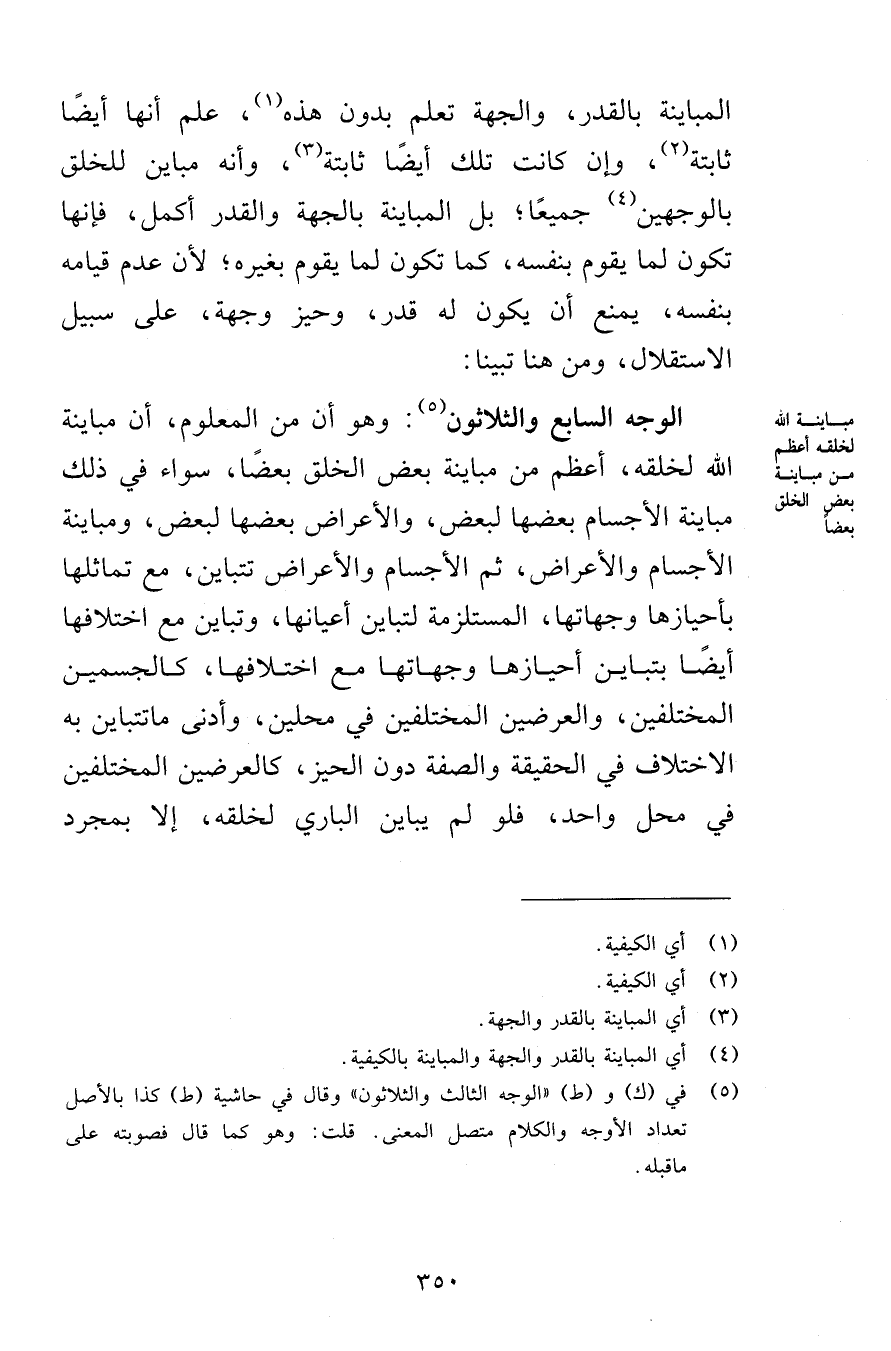 الوجه السابع والثلاثون: وهو أن من المعلوم، أن مباينة الله لخلقه، أعظم من مباينة بعض الخلق بعضًا، سواء في ذلك مباينة الأجسام بعضها لبعض، والأعراض بعضها لبعض، ومباينة الأجسام والأعراض، ثم الأجسام والأعراض تتباين، مع تماثلها بأحيازها وجهاتها، المستلزمة لتباين أعيانها، وتباين مع اختلافها أيضًا بتباين أحيازها وجهاتها مع اختلافها، كالجسمين المختلفين، والعرضين المختلفين في محلين، وأدنى ما تتباين به الاختلاف في الحقيقة والصفة دون الحيز، كالعرضين المختلفين في محل واحد، فلو لم يباين الباري لخلقه، إلا بمجرد