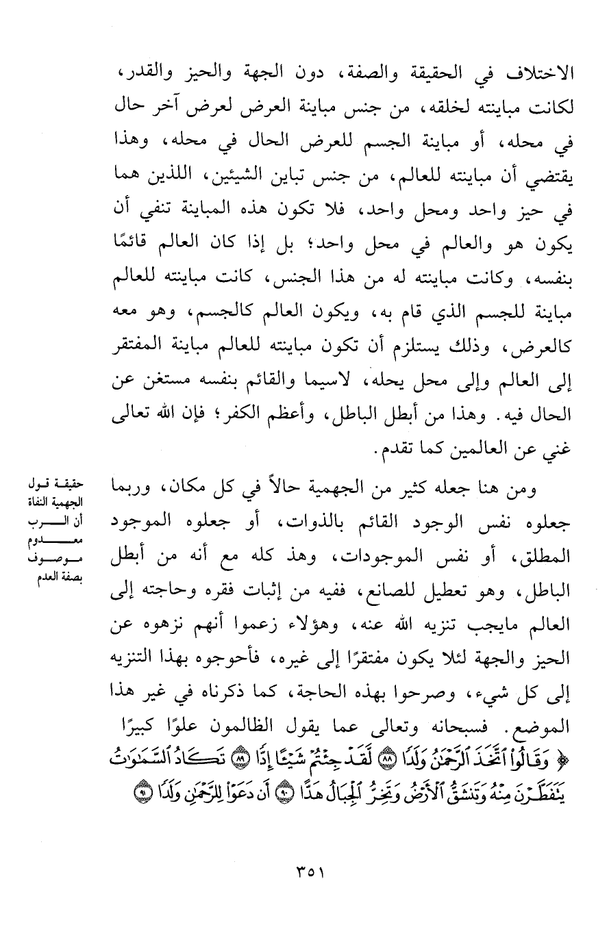 ومن هنا جعله كثير من الجهمية حالًّا في كل مكان، وربما جعلوه نفس الوجود القائم بالذوات، أو جعلوه الموجود المطلق، أو نفس الموجودات، وهذا كله مع أنه من أبطل الباطل، وهو تعطيل للصانع، ففيه من إثبات فقره وحاجته إلى العالم ما يجب تنزيه الله عنه، وهؤلاء زعموا أنهم نزهوه عن الحيز والجهة لئلا يكون مفتقرًا إلى غيره، فأحوجوه بهذا التنزيه إلى كل شيء، وصرحوا بهذه الحاجة، كما ذكنا في غير هذا الموضع. فسبحانه وتعالى عما يقول الظالمون علوًّا كبيرًا {وَقَالُوا اتَّخَذَ الرَّحْمَنُ وَلَدًا (88) لَقَدْ جِئْتُمْ شَيْئًا إِدًّا (89) تَكَادُ السَّمَاوَاتُ يَتَفَطَّرْنَ مِنْهُ وَتَنشَقُّ الْأَرْضُ وَتَخِرُّ الْجِبَالُ هَدًّا (90) أَن دَعَوْا لِلرَّحْمَنِ وَلَدًا (91)