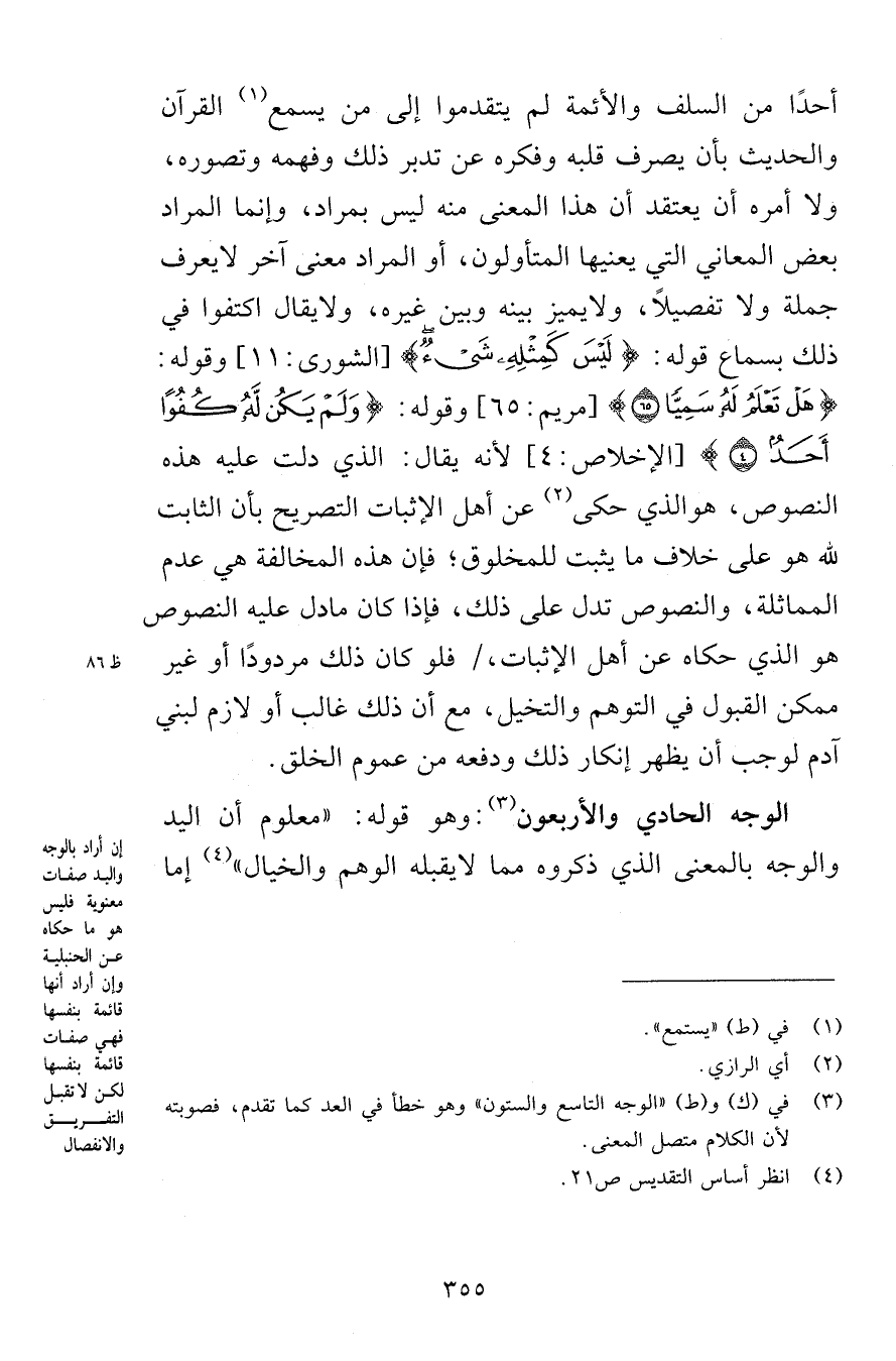 الوجه الحادي والأربعون: وهو قوله: «معلوم أن اليد والوجه بالمعنى الذي ذكروه مما لا يقبله الوهم والخيال» إما