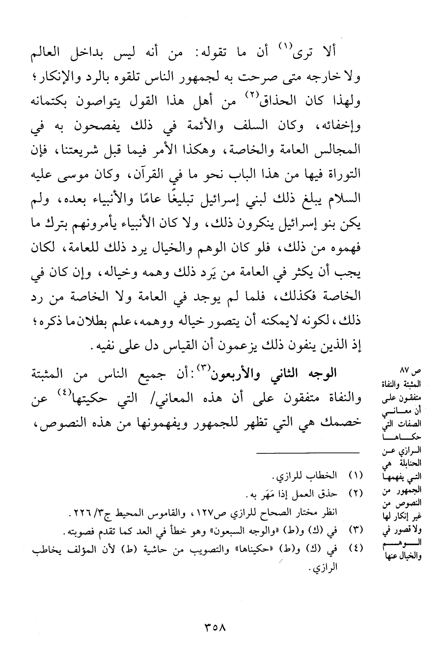 الوجه الثاني والأربعون: أن جميع الناس من المثبتة والنفاة متفقون على أن هذه المعاني التي حكيتها عن خصمك هي التي تظهر للجمهور ويفهمونها من هذه النصوص،