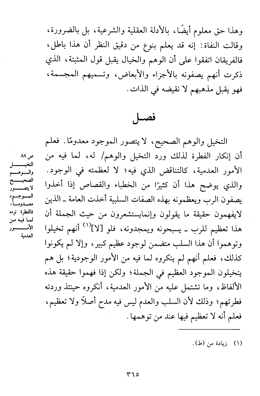 التخيل والوهم الصحيح، لا يتصور الموجود معدومًا. فعلم أن إنكار الفطرة لذلك ورد التخيل والوهم له، لما فيه من الأمور العدمية، كالتناقض الذي فيه؛ لا لعظمته في الوجود. والذي يوضح هذا أن كثيرًا من الخطباء والقصاص إذا أخذوا يصفون الرب ويعظمونه بهذه الصفات السلبية أخذت العامة -الذين لا يفهمون حقيقة ما يقولون وإنما يستشعرون من حيث الجملة أن هذا تعظيم للرب- يسبحونه ويمجدونه، فلو [لا] أنهم تخيلوا وتوهموا أن هذا السلب متضمن لوجود عظيم كبير، وإلا لم يكونوا كذلك، فعلم أنهم لم ينكروه لما فيه من الأمور الوجودية؛ بل هم يتخيلون الموجود العظيم في الجملة؛ ولكن إذا فهموا حقيقة هذه الألفاظ، وما تشتمل عليه من الأمور العدمية، أنكروه حينئذ وردته فطرتهم؛ وذلك لأن السلب والعدم ليس فيه مدح أصلًا ولا تعظيم، فعلم أنه لا تعظيم فيها عند من توهمها.