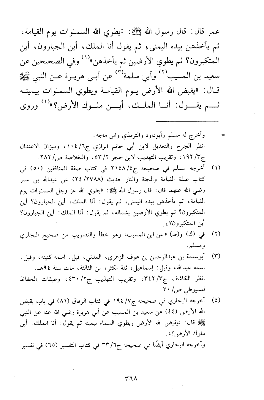 عمر قال: قال رسول الله صلى الله عليه وسلم: «يطوي الله السموات يوم القيامة، ثم يأخذهن بيده اليمنى، ثم يقول أنا الملك، أين الجبارون، أين المتكبرون؟ ثم يطوي الأرضين ثم يأخذهن» وفي الصحيحين عن سعيد بن المسيب وأبي سلمة عن أبي هريرة عن النبي صلى الله عليه وسلم قال: «يقبض الله الأرض يوم القيامة ويطوي السموات بيمينه ثم يقول: أنا الملك، أين ملوك الأرض؟ وروى