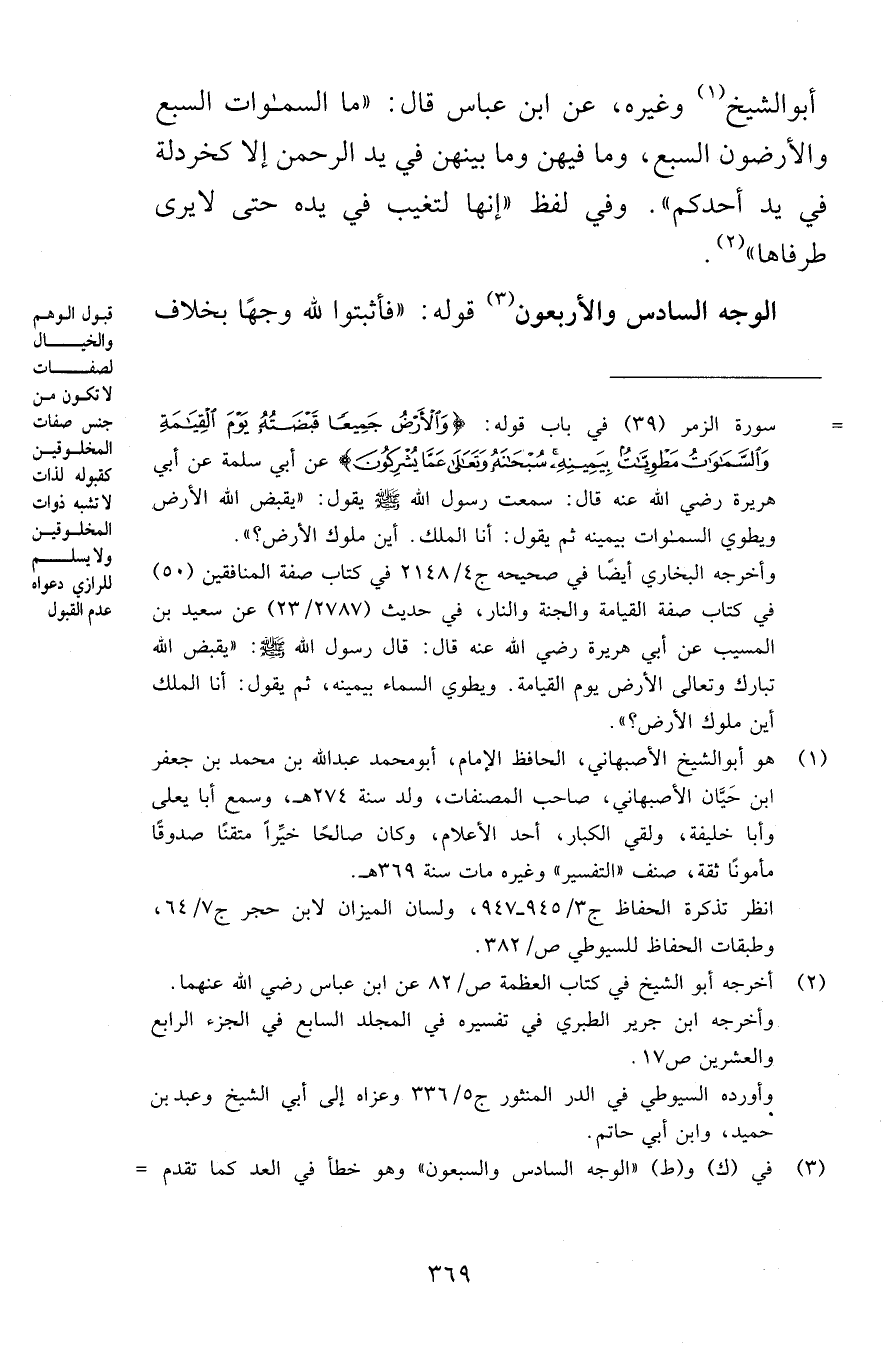 أبوالشيخ وغيره، عن ابن عباس قال: «ما السموات السبع والأرضون السبع، وما فيهن وما بينهن في يد الرحمن إلا كخردلة في يد أحدكم» . وفي لفظ «إنها لتغيب في يده حتى لا يرى طرفاها» .