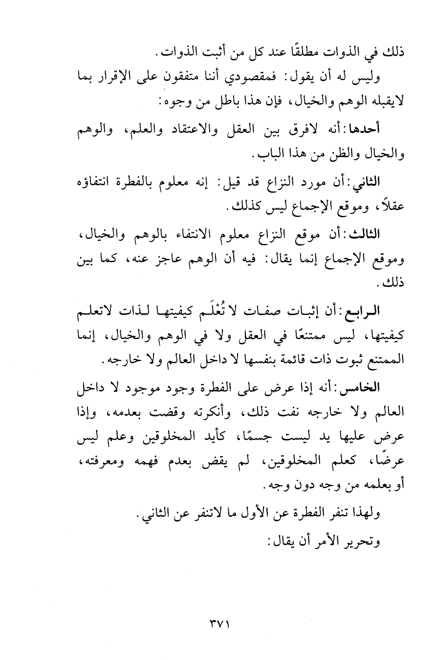 الخامس: أنه إذا عرض على الفطرة وجود موجود لا داخل العالم ولا خارجه نفت ذلك، وأنكرته وقضت بعدمه، وإذا عرض عليها يد ليست جسمًا، كأيد المخلوقين وعلم ليس عرضًا، كعلم المخلوقين، لم يقض بعدم فهمه ومعرفته، أو بعلمه من وجه دون وجه.