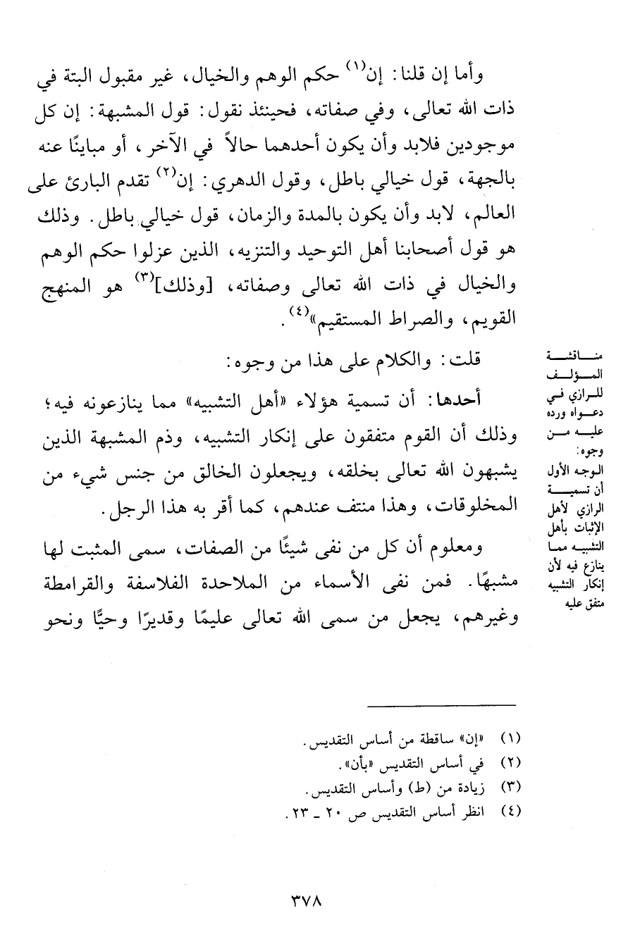 وأما إن قلنا: إن حكم الوهم والخيال، غير مقبول البتة في ذات الله تعالى، وفي صفاته، فحينئذ نقول: قول المشبهة: إن كل موجودين فلا بد وأن يكون أحدهما حالًّا في الآخر، أو مباينًا عنه بالجهة، قول خيالي باطل، وقول الدهري: إن تقدم البارئ على العالم، لا بد وأن يكون بالمدة والزمان، قول خيالي باطل. وذلك هو قول أصحابنا أهل التوحيد والتنزيه، الذين عزلوا حكم الوهم والخيال في ذات الله تعالى وصفاته، [وذلك] هو المنهج القويم، والصراط المستقيم» .