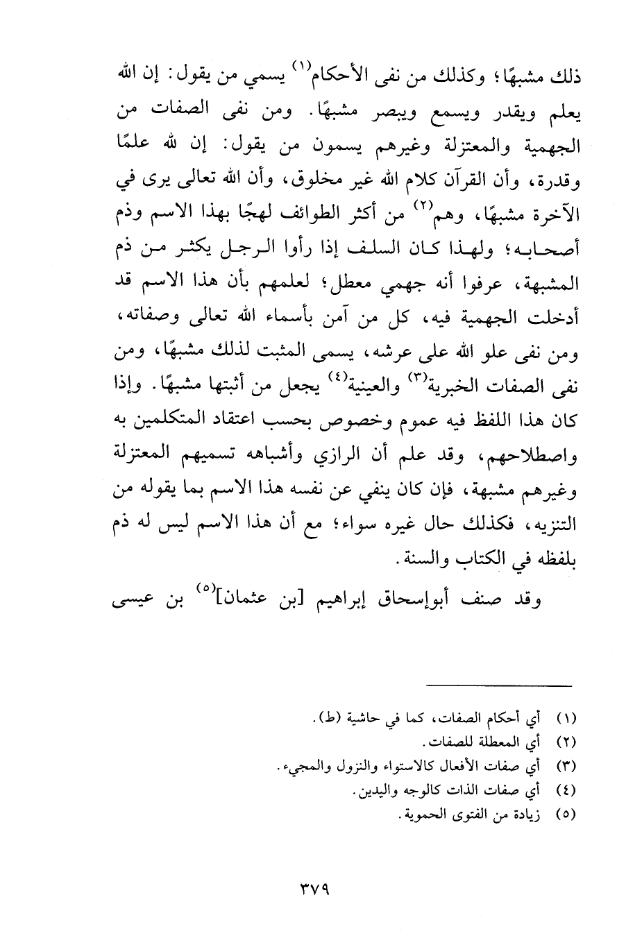 ذلك مشبهًا؛ وكذلك من نفى الأحكام يسمي من يقول: إن الله يعلم ويقدر ويسمع ويبصر مشبهًا. ومن نفى الصفات من الجهمية والمعتزلة وغيرهم يسمون من يقول: إن لله علمًا وقدرة، وأن القرآن كلام الله غير مخلوق، وأن الله تعالى يرى في الآخرة مشبهًا، وهم من أكثر الطوائف لهجًا بهذا الاسم وذم أصحابه؛ ولهذا كان السلف إذا رأوا رجل يكثر من ذم المشبهة، عرفوا أنه جهمي معطل؛ لعلمهم بأن هذا الاسم قد أدخلت الجهمية فيه، كل من آمن بأسماء الله تعالى وصفاته، ومن نفى علو الله على عرشه، يسمي المثبت لذلك مشبهًا، ومن نفى الصفات الخبرية والعينية يجعل من أثبتها مشبهًا. وإذا كان هذا اللفظ فيه عموم وخصوص بحسب اعتقاد المتكلمين به واصطلاحهم، وقد علم أن الرازي وأشباهه تسميهم المعتزلة وغيرهم مشبهة، فإن كان ينفي عن نفسه هذا الاسم بما يقوله من التنزيه، فكذلك حال غيره سواء؛ مع أن هذا الاسم ليس له ذم بلفظه في الكتاب والسنة.
