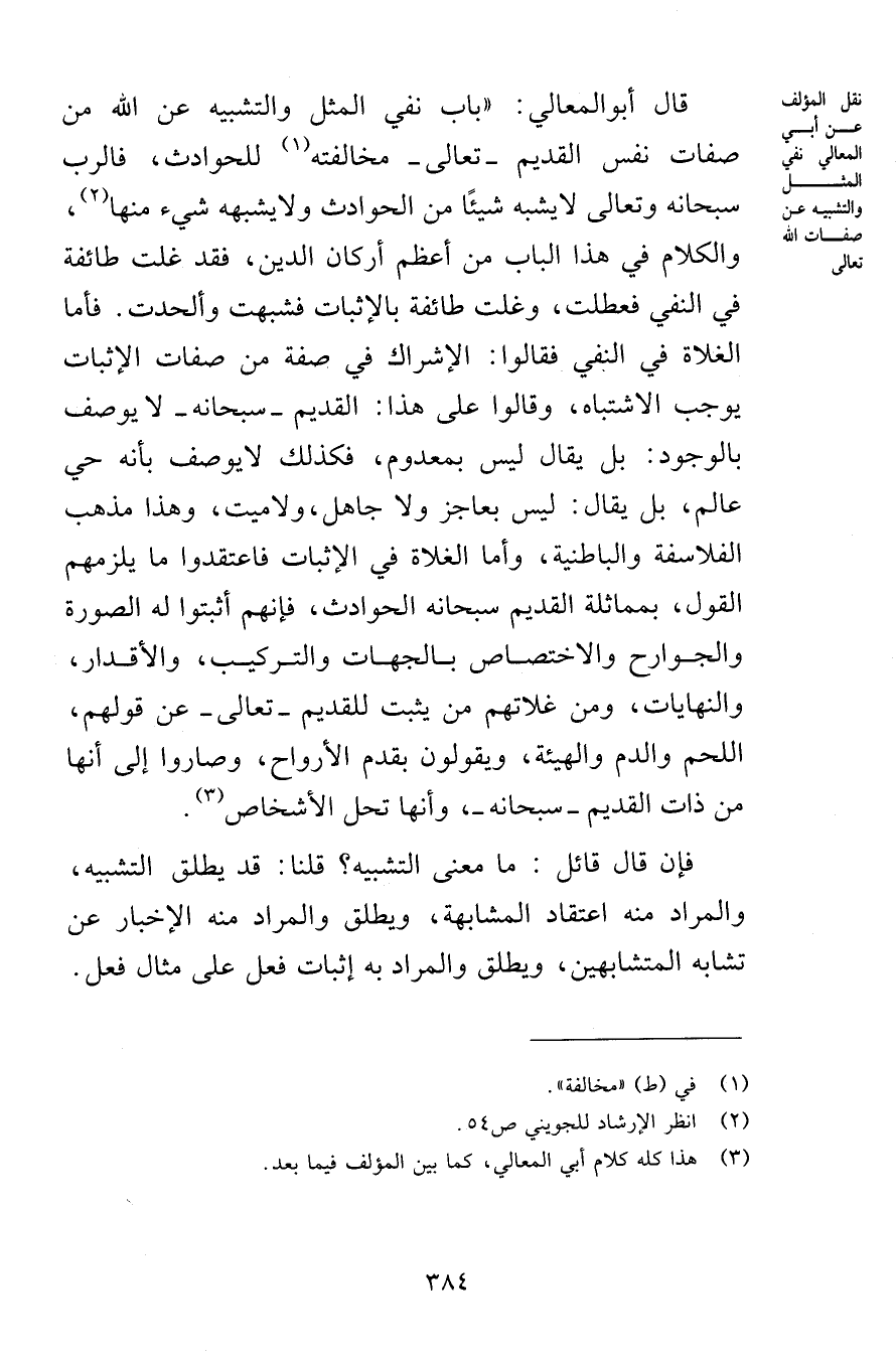 قال أبو المعالي: «باب نفي المثل والتشبيه عن الله من صفات نفس القديم -تعالى- مخالفته للحوادث، فالرب سبحانه وتعالى لا يشبه شيئًا من الحوادث ولا يشبهه شيء منها، والكلام في هذا الباب من أعظم أركان الدين، فقد غلت طائفة في النفي فعطلت، وغلت طائفة بالإثبات فشبهت وألحدت. فأما الغلاة في النفي فقالوا: الإشراك في صفة من صفات الإثبات يوجب الاشتباه، وقالوا على هذا: القديم -سبحانه- لا يوصف بالوجود: بل يقال ليس بمعدوم، فكذلك لا يوصف بأنه حي عالم، بل يقال: ليس بعاجز ولا جاهل، ولا ميت، وهذا مذهب الفلاسفة والباطنية، وأما الغلاة في الإثبات فاعتقدوا ما يلزمهم القول، بمماثلة القديم سبحانه الحوادث، فإنهم أثبتوا له الصورة والجوارح والاختصاص بالجهات والتركيب، والأقدار، والنهايات، ومن غلاتهم من يثبت للقديم -تعالى عن قولهم-، اللحم والدم والهيئة، ويقولون بقدم الأرواح، وصاروا إلى أنها من ذات القديم -سبحانه-، وأنها تحل الأشخاص.
