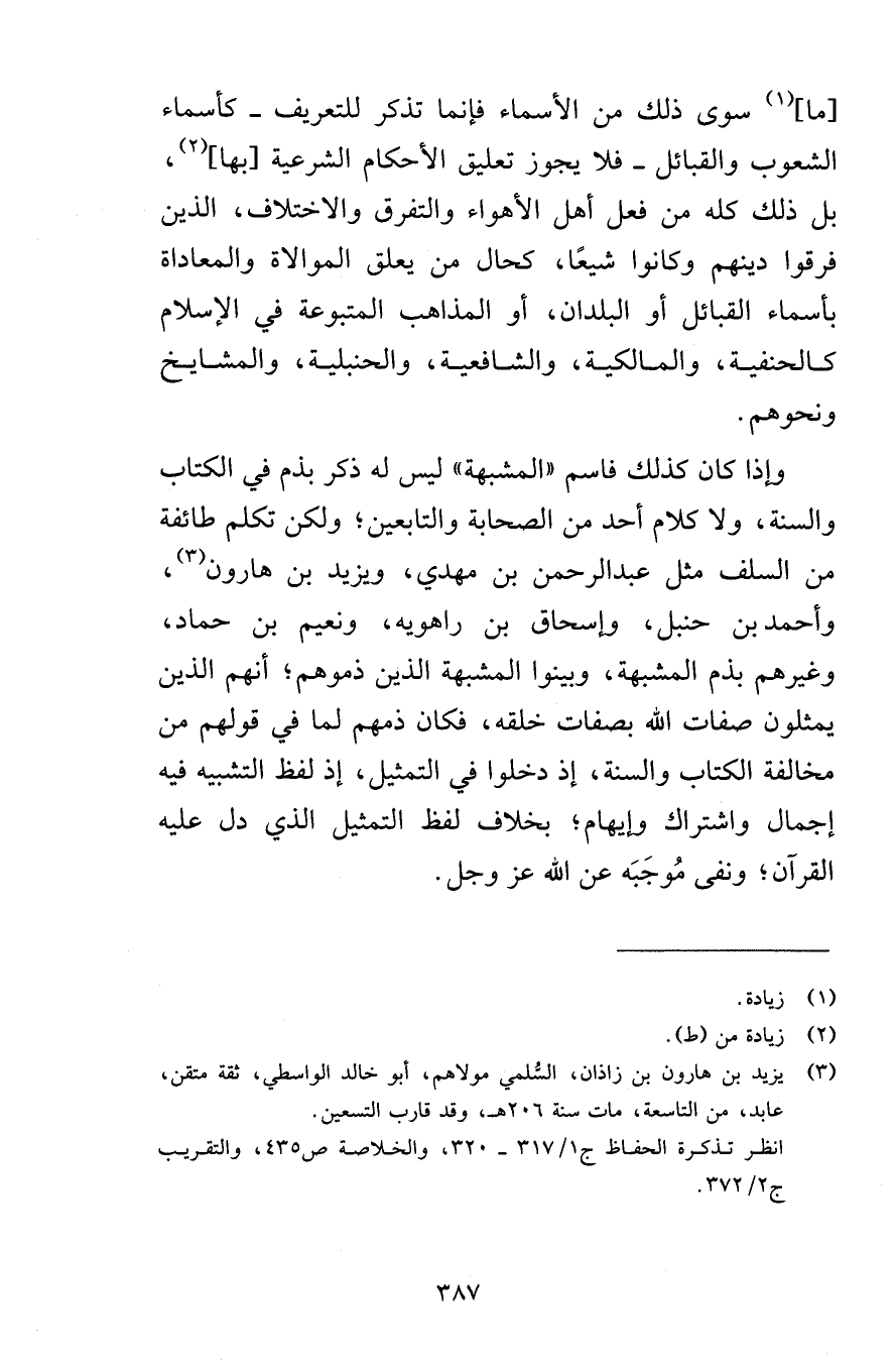 وإذا كان كذلك فاسم «المشبهة» ليس له ذكر بذم في الكتاب والسنة، ولا كلام أحد من الصحابة والتابعين؛ ولكن تكلم طائفة من السلف مثل عبد الرحمن بن مهدي، ويزيد بن هارون، وأحمد بن حنبل، وإسحاق بن راهويه، ونعيم بن حماد، وغيرهم بذم المشبهة، وبينوا المشبهة الذين ذموهم؛ أنهم الذين يمثلون صفات الله بصفات خلقه، فكان ذمهم لما في قولهم من مخالفة الكتاب والسنة، إذ دخلوا في التمثيل، إذ لفظ التشبيه فيه إجمال واشتراك وإيهام، بخلاف لفظ التمثيل الذي دل عليه القرآن؛ ونفى مُوجَبَه عن الله عز وجل.