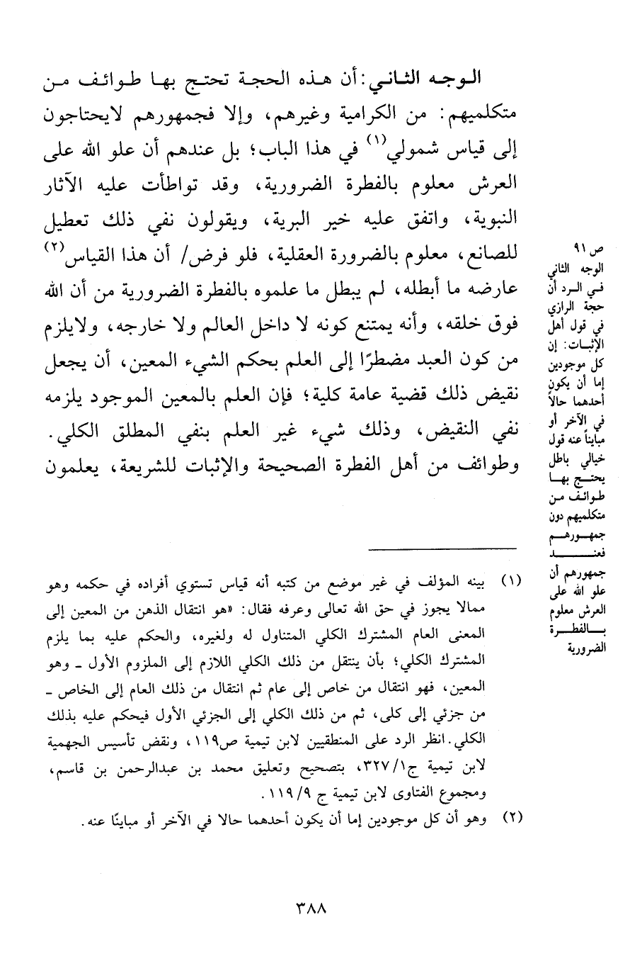 الوجه الثاني: أن هذه الحجة تحتج بها طوائف من متكلميهم: من الكرامية وغيرهم، وإلا فجمهورهم لا يحتاجون إلى قياس شمولي في هذا الباب؛ بل عندهم أن علو الله على العرش معلوم بالفطرة الضرورية، وقد تواطأت عليه الآثار النبوية، واتفق عليه خير البرية، ويقولون نفي ذلك تعطيل للصانع، معلوم بالضرورة العقلية، فلو فرض أن هذا القياس عارضه ما أبطله، لم يبطل ما علموه بالفطرة الضرورية من أن الله فوق خلقه، وأنه يمتنع كونه لا داخل العالم ولا خارجه، ولا يلزم من كون العبد مضطرًّا إلى العلم بحكم الشيء المعين، أن يجعل نقيض ذلك قضية عامة كلية؛ فإن العلم بالمعين الموجود يلزمه نفي النقيض، وذلك شيء غير العلم بنفي المطلق الكلي. وطوائف من أهل الفطرة الصحيحة والإثبات للشريعة، يعلمون
