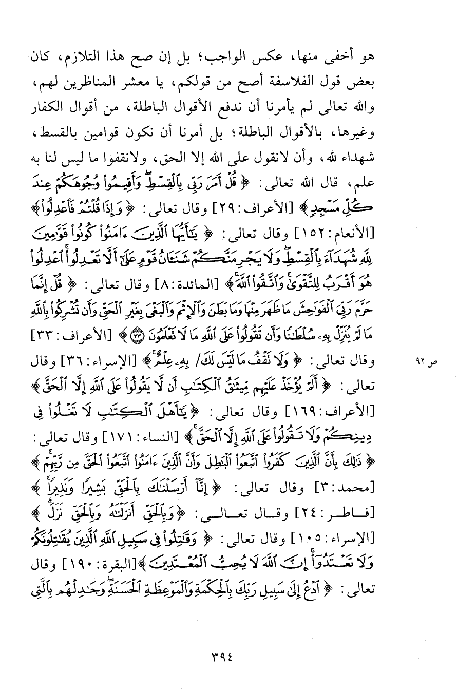 هو أخفى منها، عكس الواجب؛ بل إن صح هذا التلازم، كان بعض قول الفلاسفة أصح من قولكم، يا معشر المناظرين لهم، والله تعالى لم يأمرنا أن ندفع الأقوال الباطلة، من أقوال الكفار وغيرها، بالأقوال الباطلة؛ بل أمرنا أن نكون قوامين بالقسط، شهداء لله، وأن لا نقول على الله إلا الحق، ولا نقفوا ما ليس لنا به علم، قال الله تعالى: {قُلْ أَمَرَ رَبِّي بِالْقِسْطِ وَأَقِيمُوا وُجُوهَكُمْ عِندَ كُلِّ مَسْجِدٍ} [الأعراف: 29] وقال تعالى: {وَإِذَا قُلْتُمْ فَاعْدِلُوا} [الأنعام: 152] وقال تعالى: {يَا أَيُّهَا الَّذِينَ آمَنُوا كُونُوا قَوَّامِينَ لِلَّهِ شُهَدَاءَ بِالْقِسْطِ وَلَا يَجْرِمَنَّكُمْ شَنَآنُ قَوْمٍ عَلَى أَلَّا تَعْدِلُوا اعْدِلُوا هُوَ أَقْرَبُ لِلتَّقْوَى وَاتَّقُوا اللَّهَ} [المائدة: 8] وقال تعالى: {قُلْ إِنَّمَا حَرَّمَ رَبِّيَ الْفَوَاحِشَ مَا ظَهَرَ مِنْهَا وَمَا بَطَنَ وَالإِثْمَ وَالْبَغْيَ بِغَيْرِ الْحَقِّ وَأَن تُشْرِكُوا بِاللَّهِ مَا لَمْ يُنَزِّلْ بِهِ سُلْطَانًا وَأَن تَقُولُوا عَلَى اللَّهِ مَا لَا تَعْلَمُونَ (33) } [الأعراف: 33] وقال تعالى: {وَلَا تَقْفُ مَا لَيْسَ لَكَ بِهِ عِلْمٌ} [الإسراء: 36] وقال تعالى: {أَلَمْ يُؤْخَذْ عَلَيْهِم مِّيثَاقُ الْكِتَابِ أَن لَّا يِقُولُوا عَلَى اللَّهِ إِلَّا الْحَقَّ} [الأعراف: 169] وقال تعالى: {يَا أَهْلَ الْكِتَابِ لَا تَغْلُوا فِي دِينِكُمْ وَلَا تَقُولُوا عَلَى اللَّهِ إِلَّا الْحَقَّ} [النساء: 171] وقال تعالى: {ذَلِكَ بِأَنَّ الَّذِينَ كَفَرُوا اتَّبَعُوا الْبَاطِلَ وَأَنَّ الَّذِينَ آمَنُوا اتَّبَعُوا الْحَقَّ مِن رَّبِّهِمْ} [محمد: 3] وقال تعالى: {إِنَّا أَرْسَلْنَاكَ بِالْحَقِّ بَشِيرًا وَنَذِيرًا} [فاطر: 24] وقال تعالى: {وَبِالْحَقِّ أَنزَلْنَاهُ وَبِالْحَقِّ نَزَلَ} [الإسراء: 105] وقال تعالى: {وَقَاتِلُوا فِي سَبِيلِ اللَّهِ الَّذِينَ يُقَاتِلُونَكُمْ وَلَا تَعْتَدُوا إِنَّ اللَّهَ لَا يُحِبِّ الْمُعْتَدِينَ} [البقرة: 190] وقال تعالى: {ادْعُ إِلَى سَبِيلِ رَبِّكَ بِالْحِكْمَةِ وَالْمَوْعِظَةِ الْحَسَنَةِ وَجَادِلْهُم بِالَّتِي