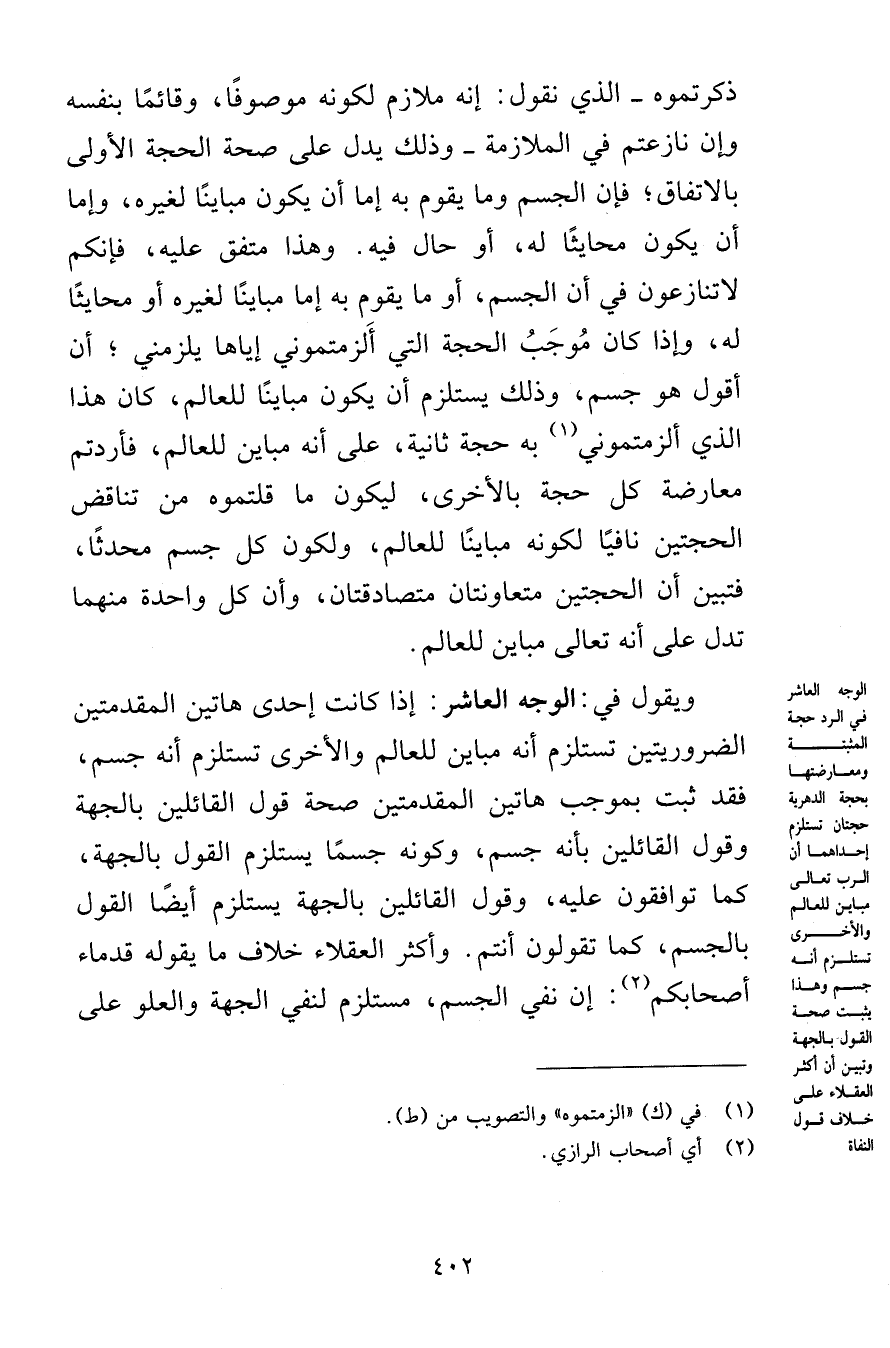 ويقول في: الوجه العاشر: إذا كانت إحدى هاتين المقدمتين الضروريتين تستلزم أنه مباين للعالم والأخرى تستلزم أنه جسم، فقد ثبت بموجب هاتين المقدمتين صحة قول القائلين بالجهة وقول القائلين بأنه جسم، وكونه جسمًا يستلزم القول بالجهة، كما توافقون عليه، وقول القائلين بالجهة يستلزم أيضًا القول بالجسم، كما تقولون أنتم. وأكثر العقلاء خلاف ما يقوله قدماء أصحابكم: إن نفي الجسم، مستلزم لنفي الجهة والعلو على