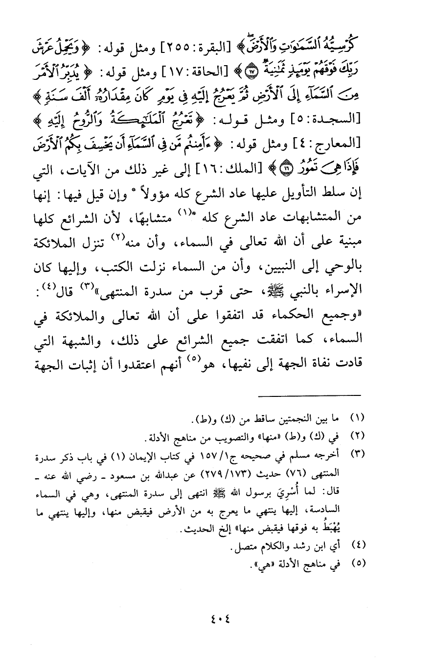 كُرْسِيُّهُ السَّمَاوَاتِ وَالْأَرْضَ} [البقرة: 255] ومثل قوله: {وَيَحْمِلُ عَرْشَ رَبِّكَ فَوْقَهُمْ يَوْمَئِذٍ ثَمَانِيَةٌ (17) } [الحاقة: 17] ومثل قوله: {يُدَبِّرُ الْأَمْرَ مِنَ السَّمَاءِ إِلَى الْأَرْضِ ثُمَّ يَعْرُجُ إِلَيْهِ فِي يَوْمٍ كَانَ مِقْدَارُهُ أَلْفَ سَنَةٍ} [السجدة: 5] ومثل قوله: {تَعْرُجُ الْمَلَائِكَةُ وَالرُّوحُ إِلَيْهِ} [المعارج: 4] ومثل قوله: {أَأَمِنتُم مَّن فِي السَّمَاءِ أَن يَخْسِفَ بِكُمُ الأَرْضَ فَإِذَا هِيَ تَمُورُ (16) } [الملك: 16] إلى غير ذلك من الآيات، التي إن سلط التأويل عليها عاد الشرع كله مؤولًا *وإن قيل فيها: إنها من المتشابهات عاد الشرع كله* متشابهًا، لأن الشرائع كلها مبنية على أن الله تعالى في السماء، وأن منه تنزل الملائكة بالوحي إلى النبيين، وأن من السماء نزلت الكتب، وإليها كان الإسراء بالنبي صلى الله عليه وسلم، حتى قرب من سدرة المنتهى» قال: «وجميع الحكماء قد اتفقوا على أن الله تعالى والملائكة في السماء، كما اتفقت جميع الشرائع على ذلك، والشبهة التي قادت نفاة الجهة إلى نفيها، هو أنهم اعتقدوا أن إثبات الجهة