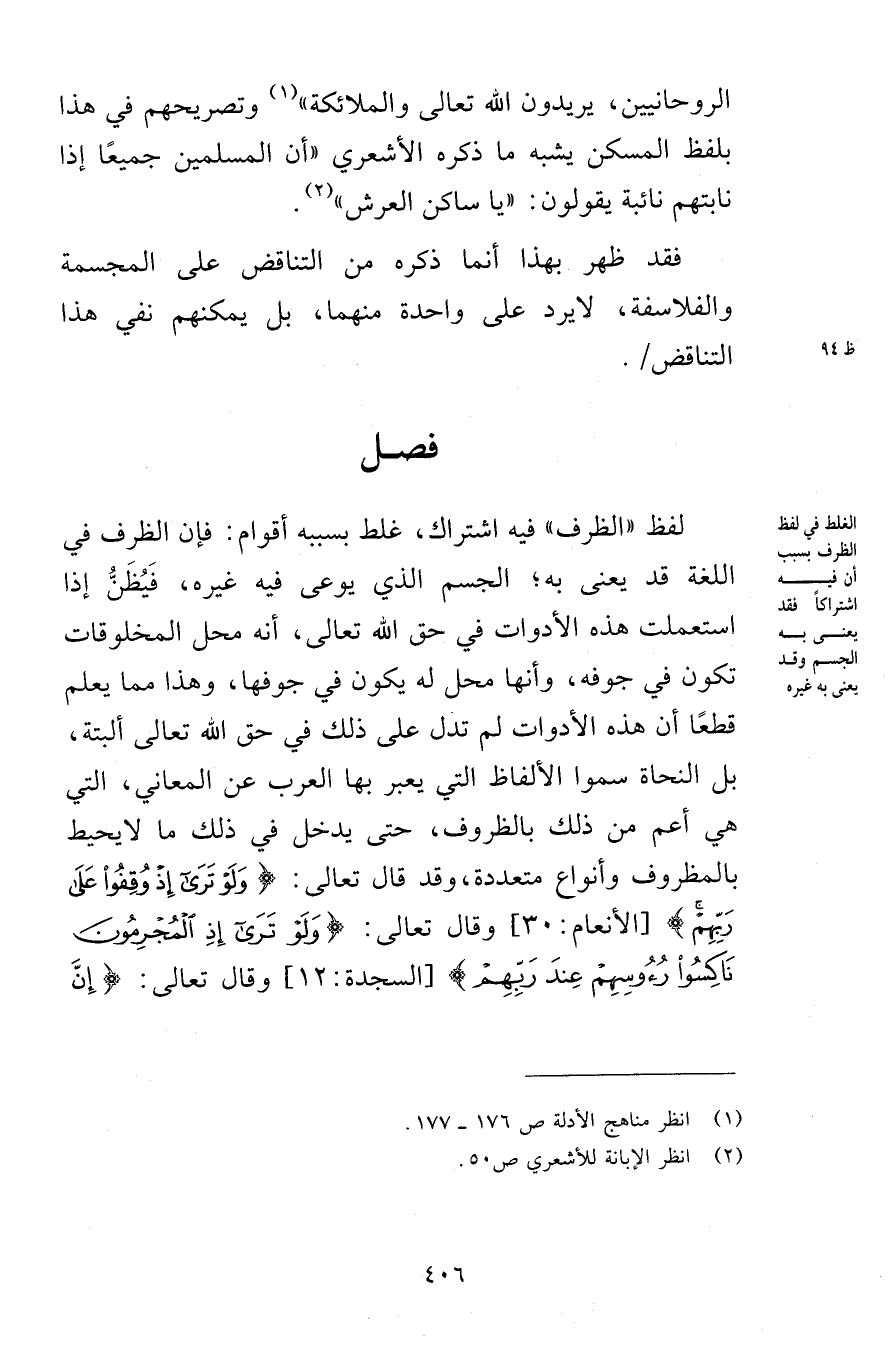 لفظ «الظرف» فيه اشتراك، غلط بسببه أقوام: فإن الظرف في اللغة قد يعنى به؛ الجسم الذي يوعى فيه غيره، فَيُظَنُّ إذا استعملت هذه الأدوات في حق الله تعالى، أنه محل المخلوقات تكون في جوفه، وأنها محل له يكون في جوفها، وهذا مما يعلم قطعًا أن هذه الأدوات لم تدل على ذلك في حق الله تعالى ألبتة، بل النحاة سموا الألفاظ التي يعبر بها العرب عن المعاني، التي هي أعم من ذلك بالظروف، حتى يدخل في ذلك ما لا يحيط بالمظروف وأنواع متعددة، وقد قال تعالى: {وَلَوْ تَرَى إِذْ وُقِفُوا عَلَى رَبِّهِمْ} [الأنعام: 30] وقال تعالى: {وَلَوْ تَرَى إِذِ الْمُجْرِمُونَ نَاكِسُو رُءُوسِهِمْ عِندَ رَبِّهِمْ} [السجدة: 12] وقال تعالى: {إِنَّ