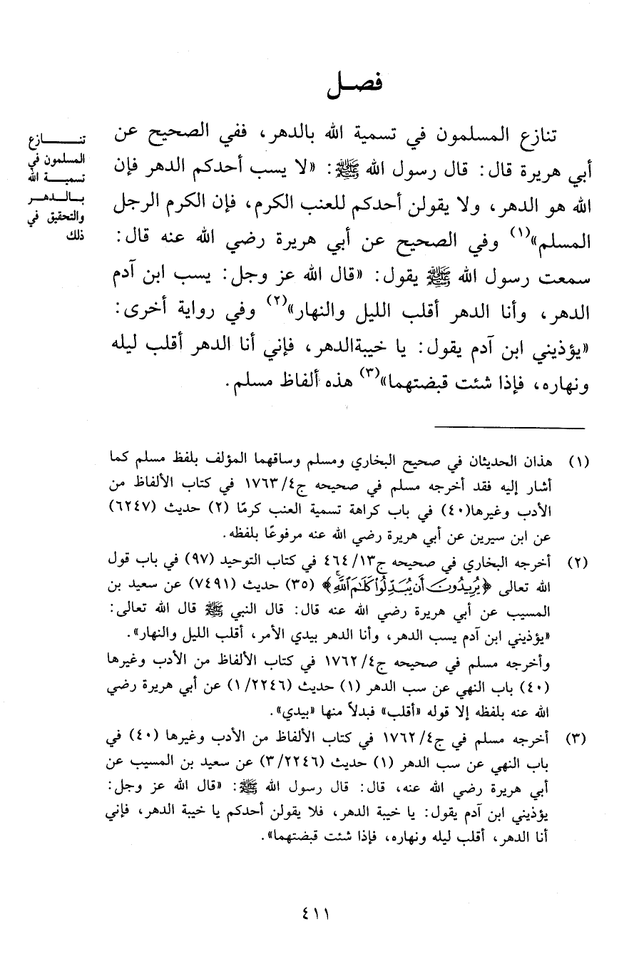 تنازع المسلمون في تسمية الله بالدهر، ففي الصحيح عن أبي هريرة قال: قال رسول الله صلى الله عليه وسلم: «لا يسب أحدكم الدهر فإن الله هو الدهر، ولا يقولن أحدكم للعنب الكرم، فإن الكرم الرجل المسلم» وفي الصحيح عن أبي هريرة رضي الله عنه قال: سمعت رسول الله صلى الله عليه وسلم يقول: «قال الله عز وجل: يسب ابن آدم الدهر، وأنا الدهر، أقلب الليل والنهار» وفي رواية أخرى: «يؤذيني ابن آدم يقول: يا خيبة الدهر، فإني أنا الدهر أقلب ليله ونهاره، فإذا شئت قبضتهما» هذه ألفاظ مسلم.
