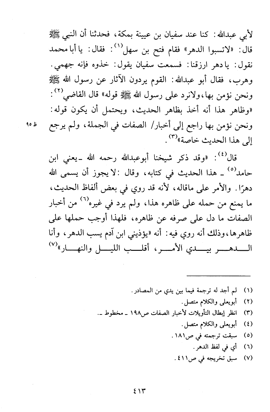 لأبي عبد الله: كنا عند سفيان بن عيينة بمكة، فحدثنا أن النبي صلى الله عليه وسلم قال: «لا تسبوا الدهر» فقام فتح بن سهل فقال: يا أبا محمد نقول: يا دهر ارزقنا: فسمعت سفيان يقول: خذوه فإنه جهمي. وهرب، فقال أبو عبد الله: القوم يردون الآثار عن رسول الله صلى الله عليه وسلم ونحن نؤمن بها، ولا نرد على رسول الله صلى الله عليه وسلم قوله» قال القاضي: «وظاهر هذا أنه أخذ بظاهر الحديث، ويحتمل أن يكون قوله: ونحن نؤمن بها راجع إلى أخبار الصفات في الجملة، ولم يرجع إلى هذا الحديث خاصة» .
